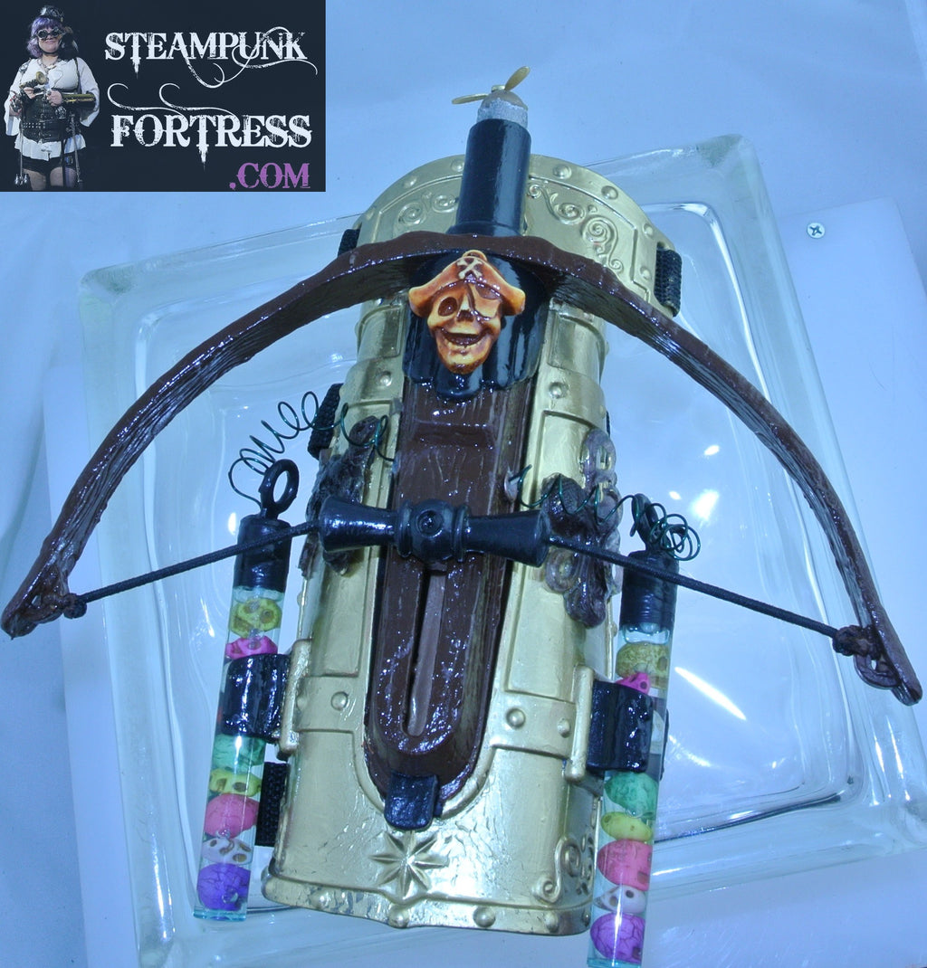 CROSSBOW BRASS ARM GAUNTLET PIRATE THEME COSPLAY BLACK SKULL CROSSBONES PURPLE OCTOPUS HOWLITE GEMSTONE SKULLS STARR WILDE STEAMPUNK FORTRESS SHOOTS FIRES NERF DARTS