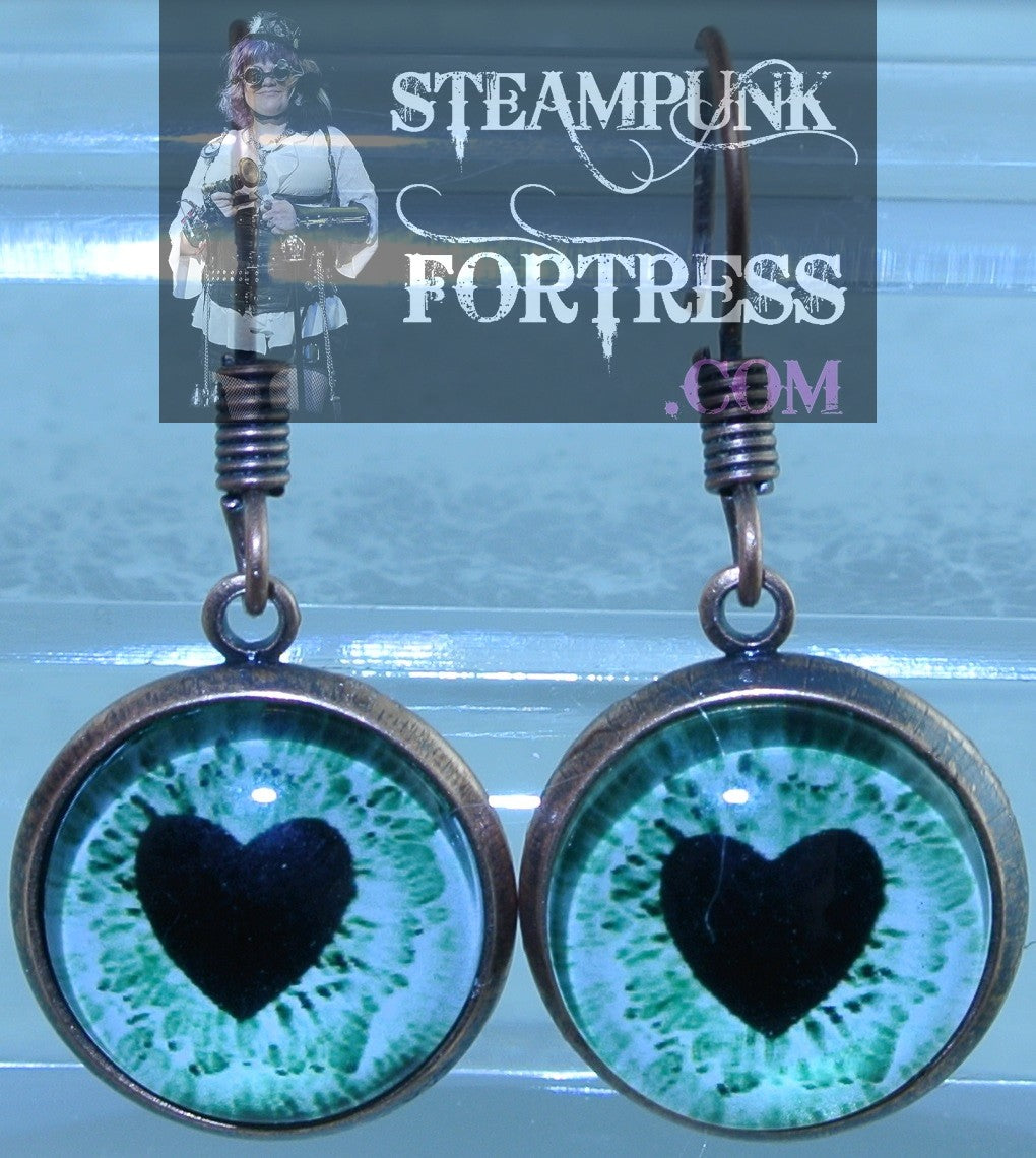 COPPER EYE GREEN HEART PUPIL PIERCED EARRINGS HALLOWEEN STARR WILDE STEAMPUNK FORTRESS