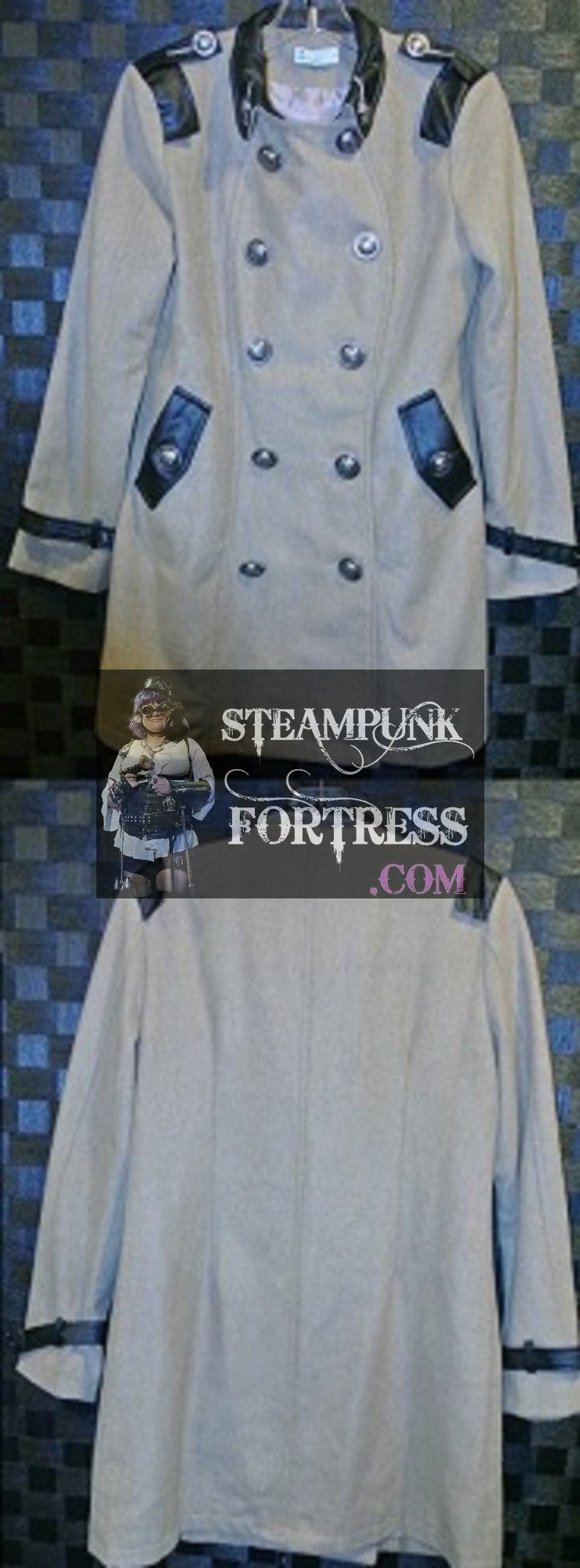 THIS IS A FABULOUS STEAMPUNK DIESELPUNK CYBERPUNK, VICTORIAN, EDWARDIAN, COSPLAY, COSTUME, SDCC, COMIC CON…..MASS PRODUCED....GORGEOUS TAN FAUX LEATHER BROWN TRIM SILVER DOUBLE BREASTED BUTTONS JACKET COAT...STUNNING...#2637