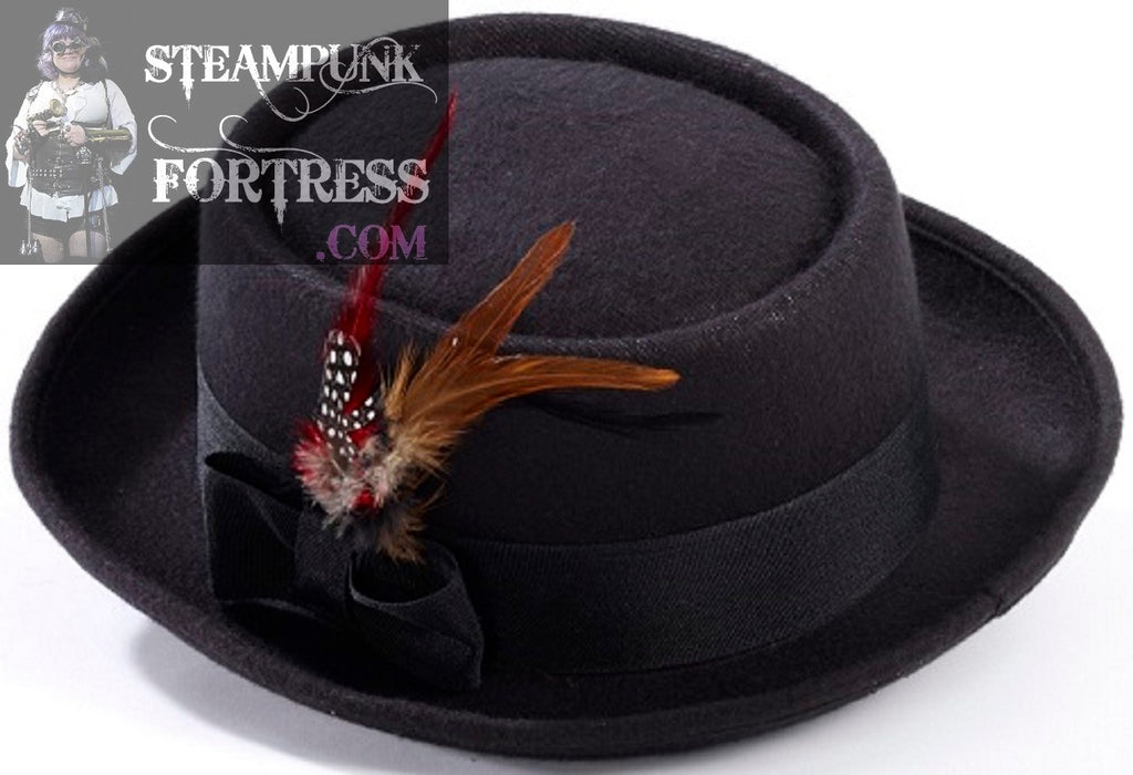 BLACK PORK PIE HAT RED GOLD GUINEA FEATHERS COPPER TV SHOW HAT STEAMPUNK HAT STEAMPUNK FORTRESS- MASS PRODUCED