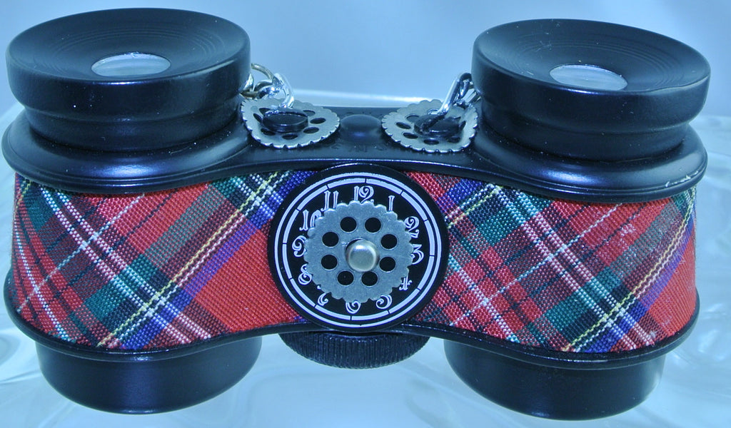 VINTAGE STEAMPUNK RED SMALL BINOCULARS OPERA GLASSES BICYCLE GEARS GUNMETAL CHAIN CLASP STARR WILDE STEAMPUNK FORTRESS