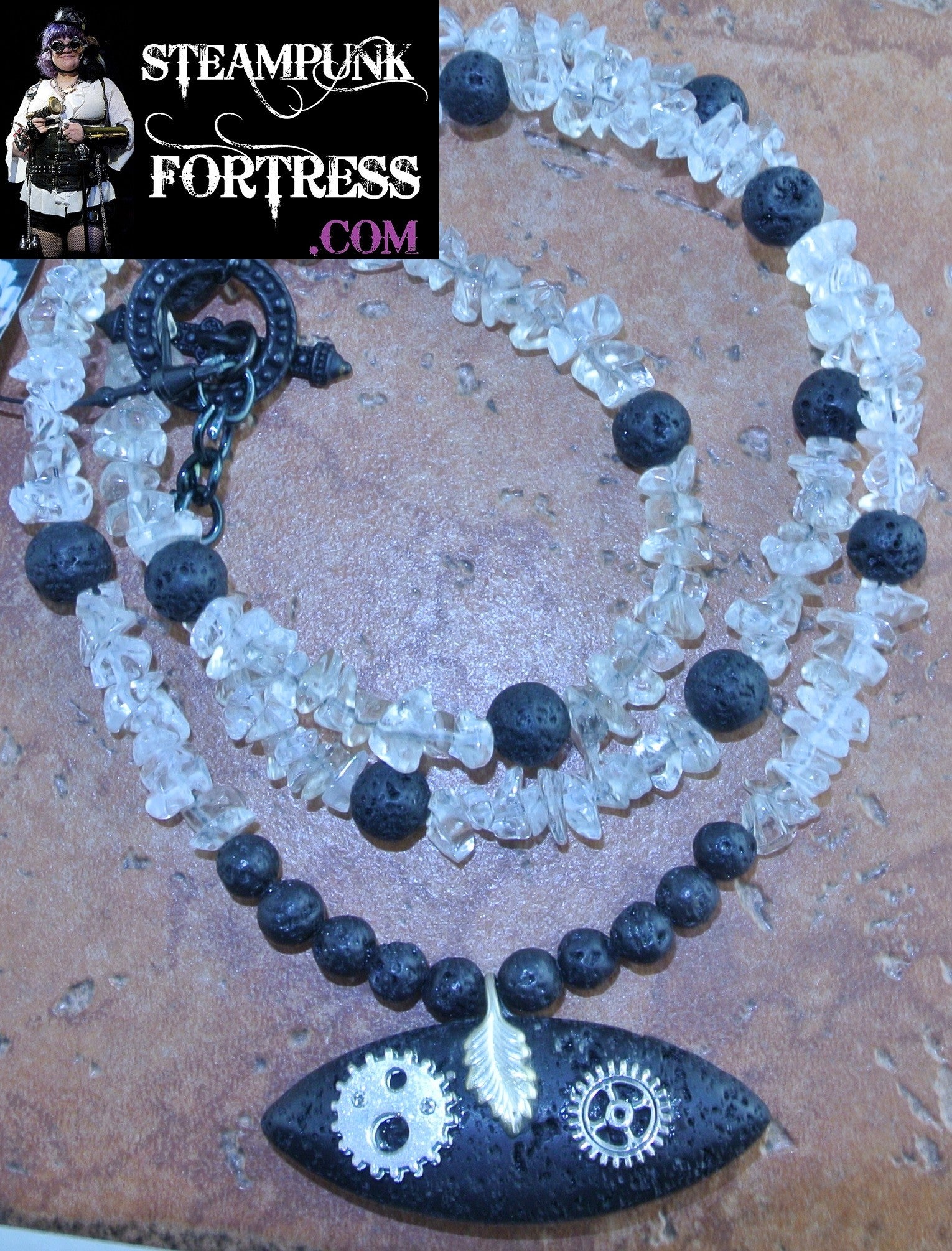 BLACK LAVA ROCK GEMSTONES STONES POINTED OVAL CLEAR QUARTZ CHIPS LAVA ROUNDS SILVER GEARS NECKLACE SET AVAILABLE STARR WILDE STEAMPUNK FORTRESS
