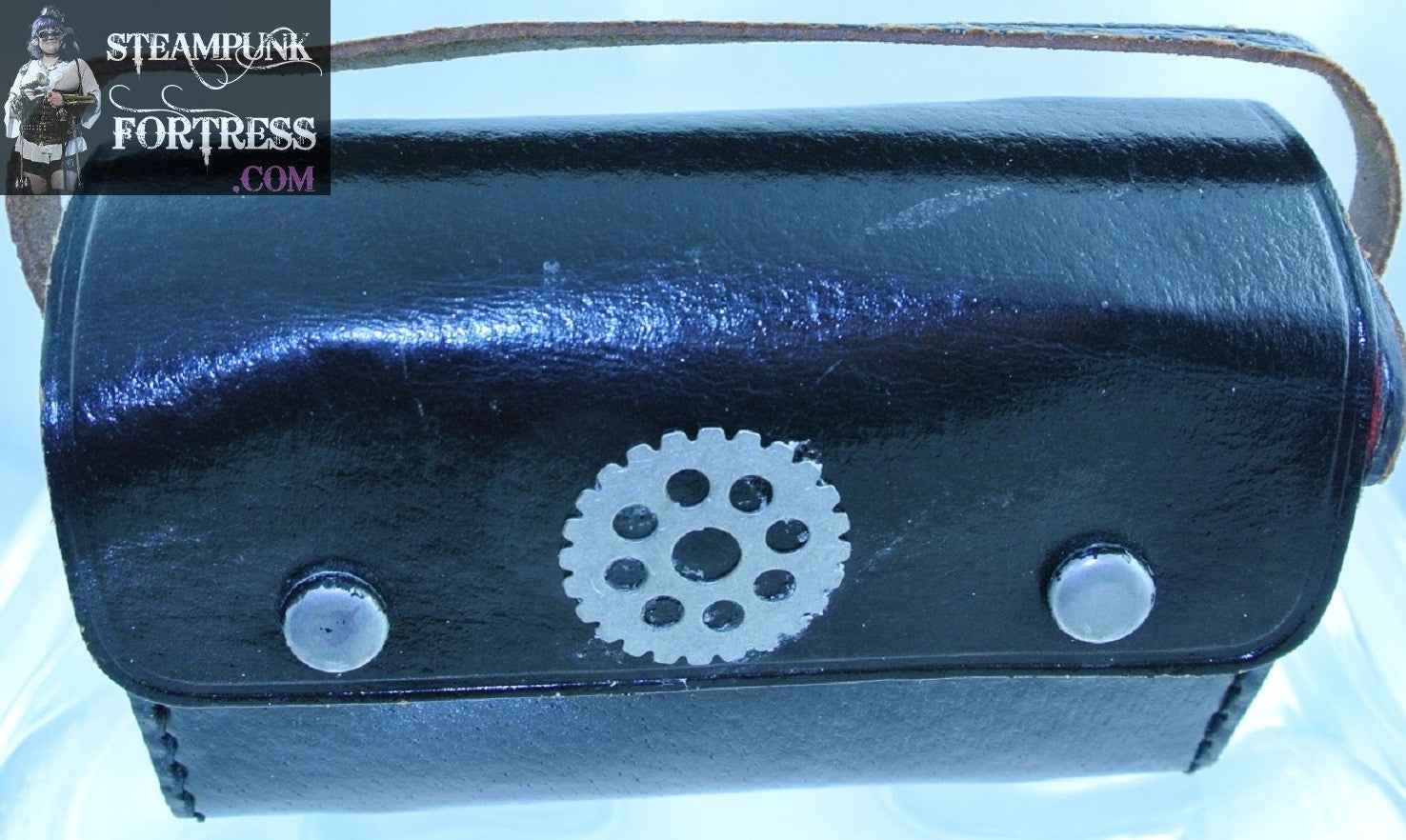 BLACK SMALL LEATHER WITH STRAP SILVER ROUND GEAR WATCH CLOCK BAG PURSE STARR WILDE STEAMPUNK FORTRESS COSPLAY COSTUME