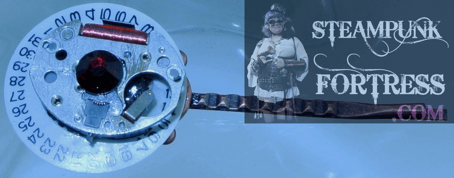 THIS IS A FABULOUS HANDMADE CUSTOM MADE STEAMPUNK DIESELPUNK CYBERPUNK HAIR ACCESSORY... ...COPPER BOBBY PIN....DATE DIAL WATCH CLOCK SILVER COMPLETE AUTHENTIC MOVEMENT WITH COPPER COIL AND RED SWAROVSKI CRYSTAL ON IT...#2525