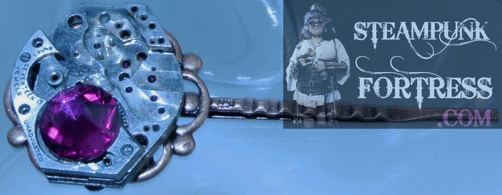 Bags & Purses; Barrettes & Hair combs, Hair Tiaras; Binoculars/Opera Glasses; BTS merchandise- Photocards, custom jewelry etc; Canes- including telescope canes and ones that break down; Clocks; Crossbows-Wrist Gauntlets; Fans; Garters-Arm & Leg for Men and Women; Gauntlets & Bracers (including Vegan options); Gloves; Goggles & Glasses; Hats & Helmets; Home Decor- including Christmas Ornaments & Wreaths; Jewelry- Bracelets, Cufflinks, Earrings- Clips & Pierced, Necklaces, Pins/Brooches, Rings, Tie Tacks & More; Masks; Parasols; Pocketwatches; Purses; Ray Guns; Skirt Lifters; Stockings/Thigh Highs; Tea Dueling Supplies (including Vegan options); Top Hats- Mini & Full; Umbrellas; Vintage Ladies Jewelry Collection- Performers from the Belle Epoque photos into jewelry; Watches; Weaponry-Knives & Swords (Real and Replica); Wings and More. Starr can also repair your precious jewelry, restring pearls, change pierced earrings to clip earrings or clip earrings to pierced earrings. She can also work with you to design a custom piece of jewelry or hat, or weapons etc. She can also customize any piece we have in stock such as adding a veil to a hat, etc. Call or e-mail to make an appointment. Visit our store: Steampunk Fortress.