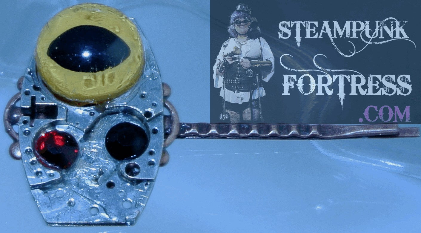 Bags & Purses; Barrettes & Hair combs, Hair Tiaras; Binoculars/Opera Glasses; BTS merchandise- Photocards, custom jewelry etc; Canes- including telescope canes and ones that break down; Clocks; Crossbows-Wrist Gauntlets; Fans; Garters-Arm & Leg for Men and Women; Gauntlets & Bracers (including Vegan options); Gloves; Goggles & Glasses; Hats & Helmets; Home Decor- including Christmas Ornaments & Wreaths; Jewelry- Bracelets, Cufflinks, Earrings- Clips & Pierced, Necklaces, Pins/Brooches, Rings, Tie Tacks & More; Masks; Parasols; Pocketwatches; Purses; Ray Guns; Skirt Lifters; Stockings/Thigh Highs; Tea Dueling Supplies (including Vegan options); Top Hats- Mini & Full; Umbrellas; Vintage Ladies Jewelry Collection- Performers from the Belle Epoque photos into jewelry; Watches; Weaponry-Knives & Swords (Real and Replica); Wings and More. Starr can also repair your precious jewelry, restring pearls, change pierced earrings to clip earrings or clip earrings to pierced earrings. She can also work with you to design a custom piece of jewelry or hat, or weapons etc. She can also customize any piece we have in stock such as adding a veil to a hat, etc. Call or e-mail to make an appointment. Visit our store: Steampunk Fortress.THIS IS A FABULOUS HANDMADE CUSTOM MADE STEAMPUNK DIESELPUNK CYBERPUNK HAIR ACCESSORY... ...COPPER BOBBY PIN....SILVER AUTHENTIC WATCH CLOCK MOVEMENT WITH RED AND BLACK SWAROVSKI CRYSTAL AND YELLOW CATS EYE ON IT...#2850