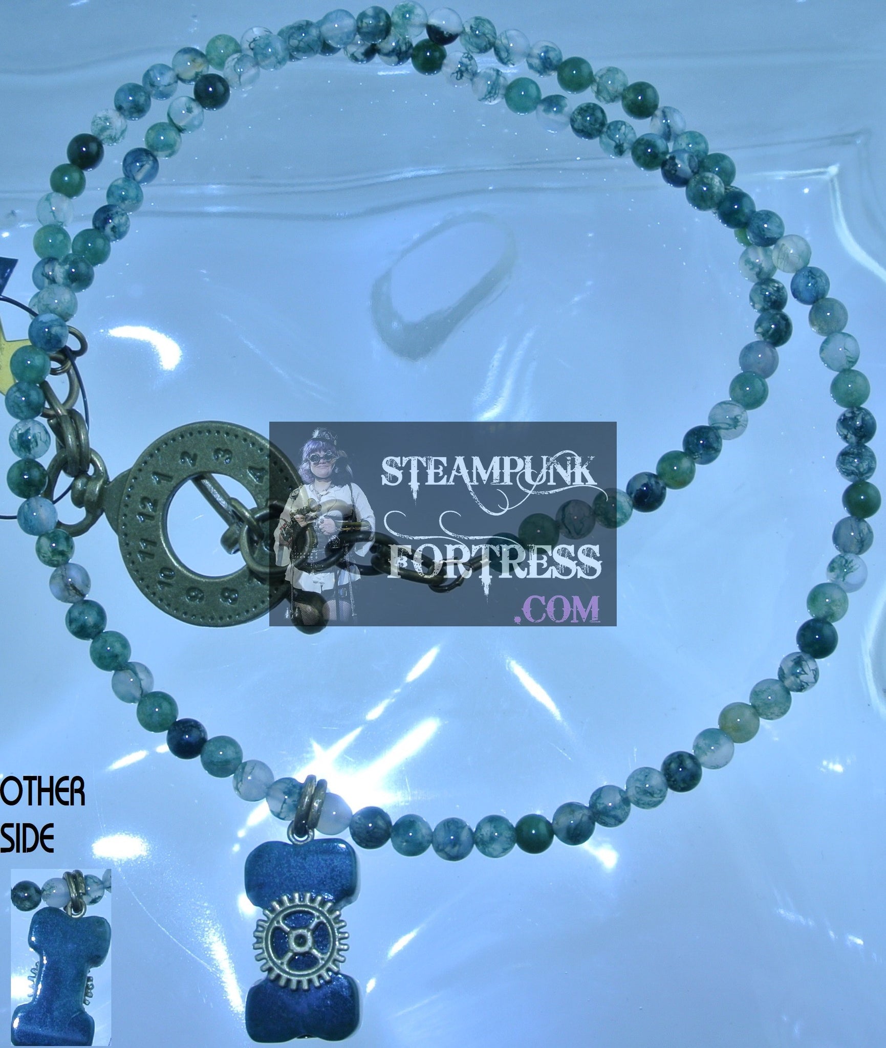 BRASS AGATE MOSS DOG BONE BRASS GEAR GEMSTONES STONES ROUNDS NECKLACE SET AVAILABLE STARR WILDE STEAMPUNK FORTRESS