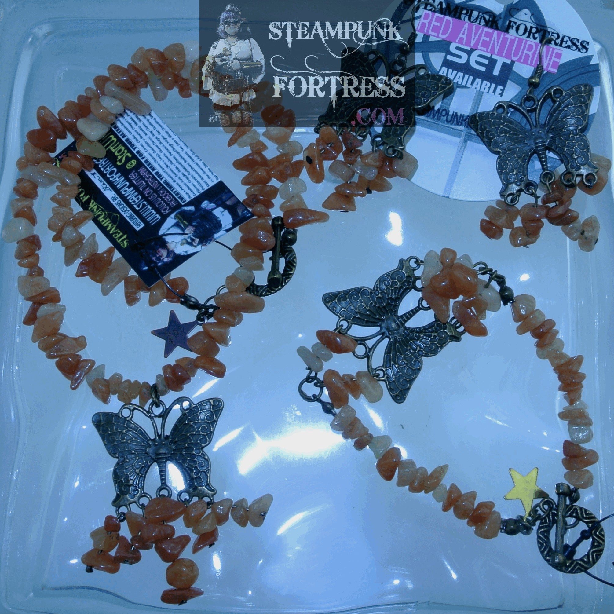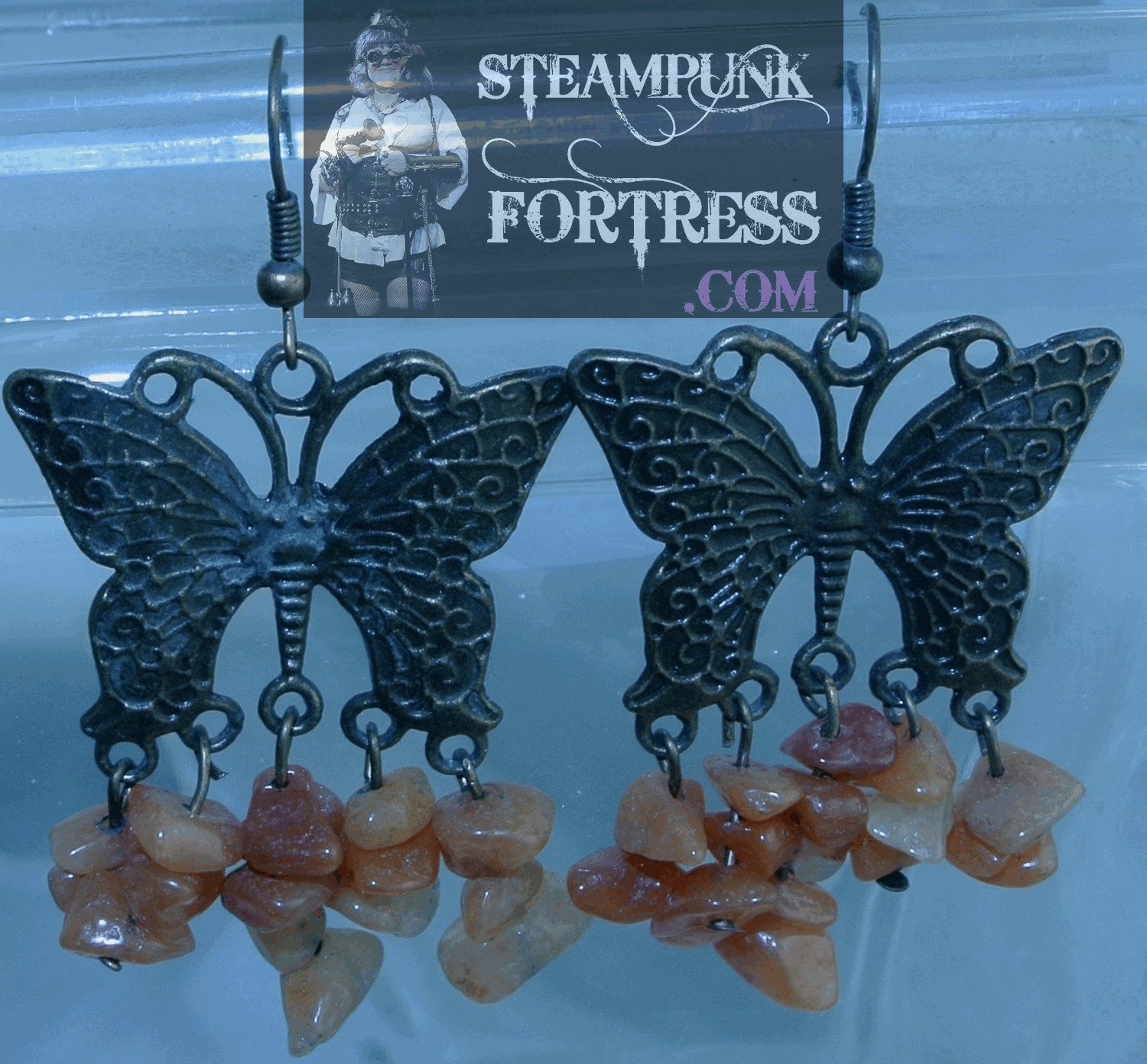 BRASS BUTTERFLY BUTTERFLIES AVENTURINE RED GEMSTONES STONES CHIPS DROPS PIERCED EARRINGS SET AVAILABLE STARR WILDE STEAMPUNK FORTRESS
