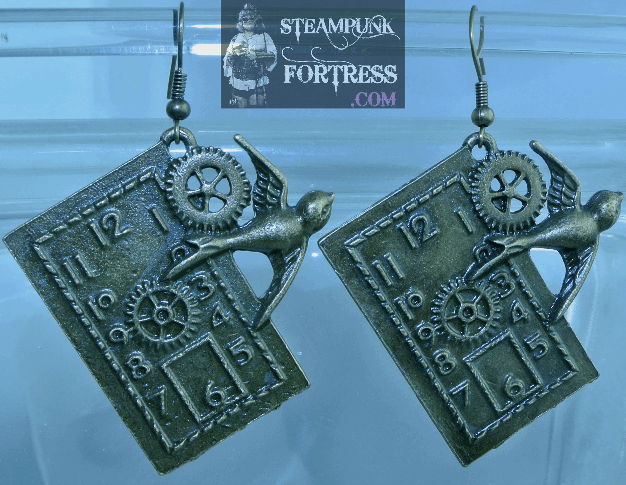 BRASS CLOCK FACE WATCH DIAL RECTANGLE BIRD GEARS PIERCED EARRINGS SET AVAILABLE STARR WILDE STEAMPUNK FORTRESS