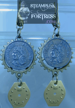 BRASS COINS GEAR SEIKO WATCH CLOCK AUTHENTIC GENUINE DIAL FACE PIERCED EARRINGS SET AVAILABLE STARR WILDE STEAMPUNK FORTRESS