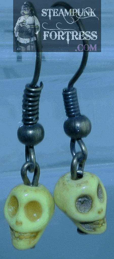 BRASS SKULLS HOWLITE YELLOW TINY PIRATE HALLOWEEN GEMSTONE BRASS PIERCED EARRINGS STARR WILDE STEAMPUNK FORTRESS