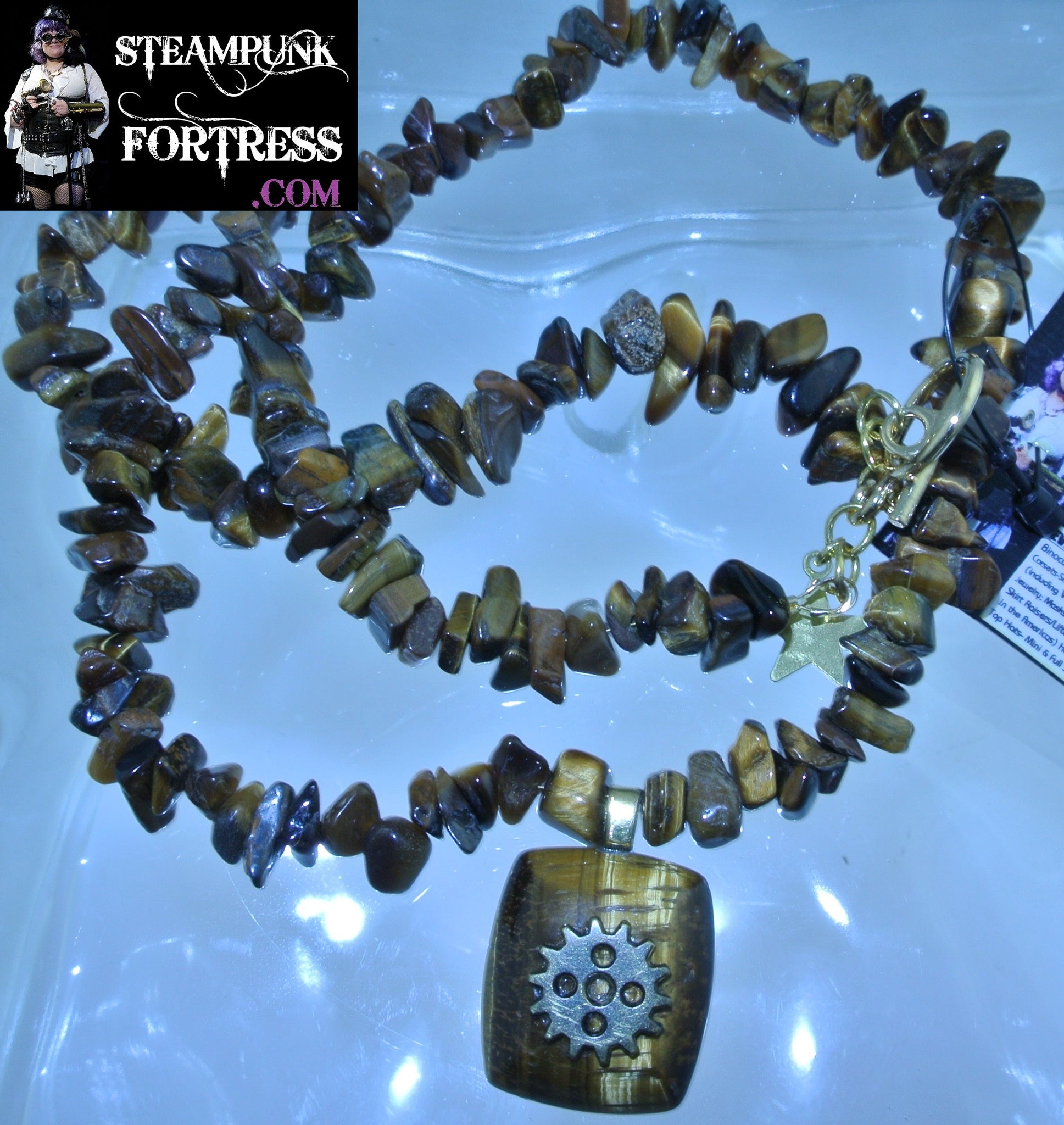 GOLD TIGERS EYE GEMSTONE RECTANGLE BRASS WATCH CLOCK GEAR GEMSTONES STONES CHIPS NECKLACE SET AVAILABLE 2 SIDED REVERSIBLE STARR WILDE STEAMPUNK FORTRESS