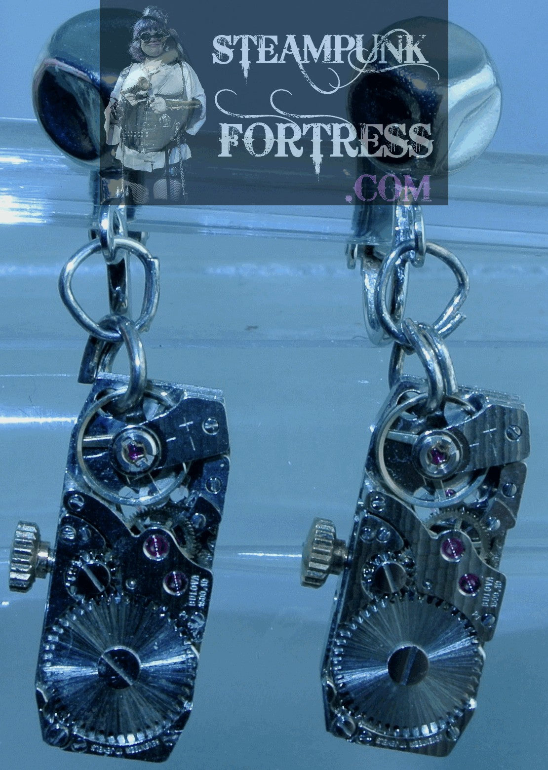 THIS IS A FABULOUS HANDMADE CUSTOM MADE STEAMPUNK DIESELPUNK CYBERPUNK, MEDIEVAL, RENAISSANCE, VICTORIAN, RENAISSANCE, EDWARDIAN, COSPLAY, COSTUME, SDCC, COMIC CON…..SILVER TONE STEAMPUNK CLIP EARRINGS....1 COMPLETE AUTHENTIC BULOVA RECTANGULAR MOVEMENT ON EACH HOOK..#2545