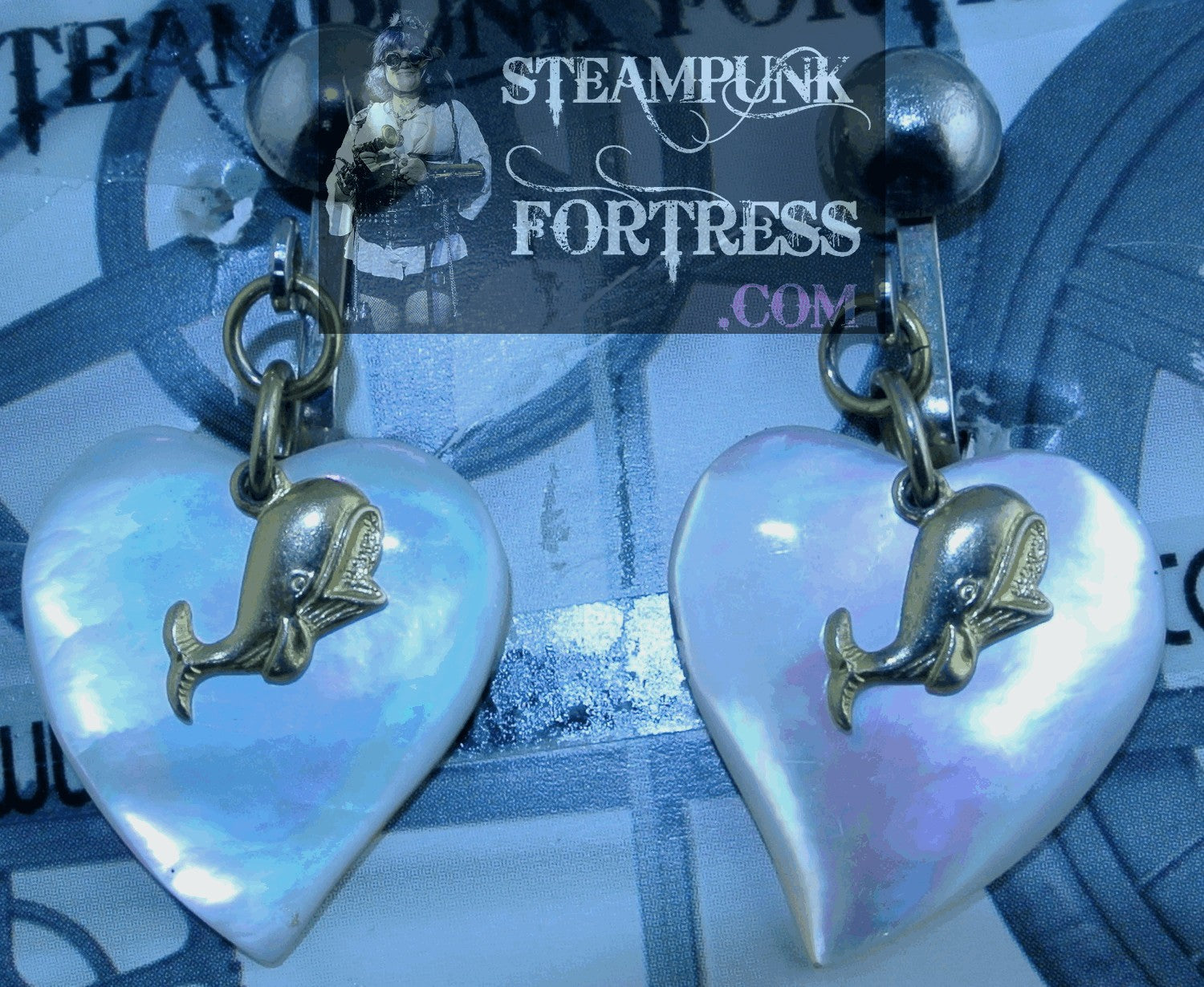 THIS IS A FABULOUS HANDMADE CUSTOM MADE STEAMPUNK DIESELPUNK CYBERPUNK, MEDIEVAL, RENAISSANCE, VICTORIAN, RENAISSANCE, EDWARDIAN, COSPLAY, COSTUME, SDCC, COMIC CON….CLIPS EARRINGS.....SILVER TONE...CLIPS....1 GOLD TONE WHALE AND 1 MOTHER OF THE PEARL HEART ON EACH CLIP.......#3647