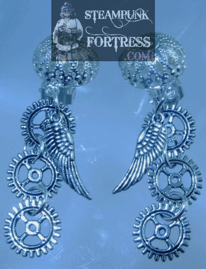 CLIPS SILVER WINGS SMALL TINY 3 4 ARM GEARS FILIGREE CLIP ON EARRINGS FAIRY HALLOWEEN STARR WILDE STEAMPUNK FORTRESS