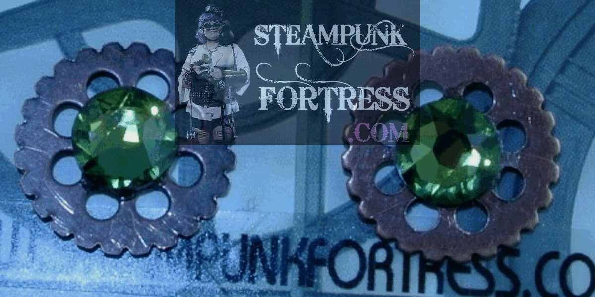 COPPER GEARS ROUND 7MM GREEN SWAROVSKI CRYSTALS STUDS PIERCED EARRINGS WATCH CLOCK STARR WILDE STEAMPUNK FORTRESS