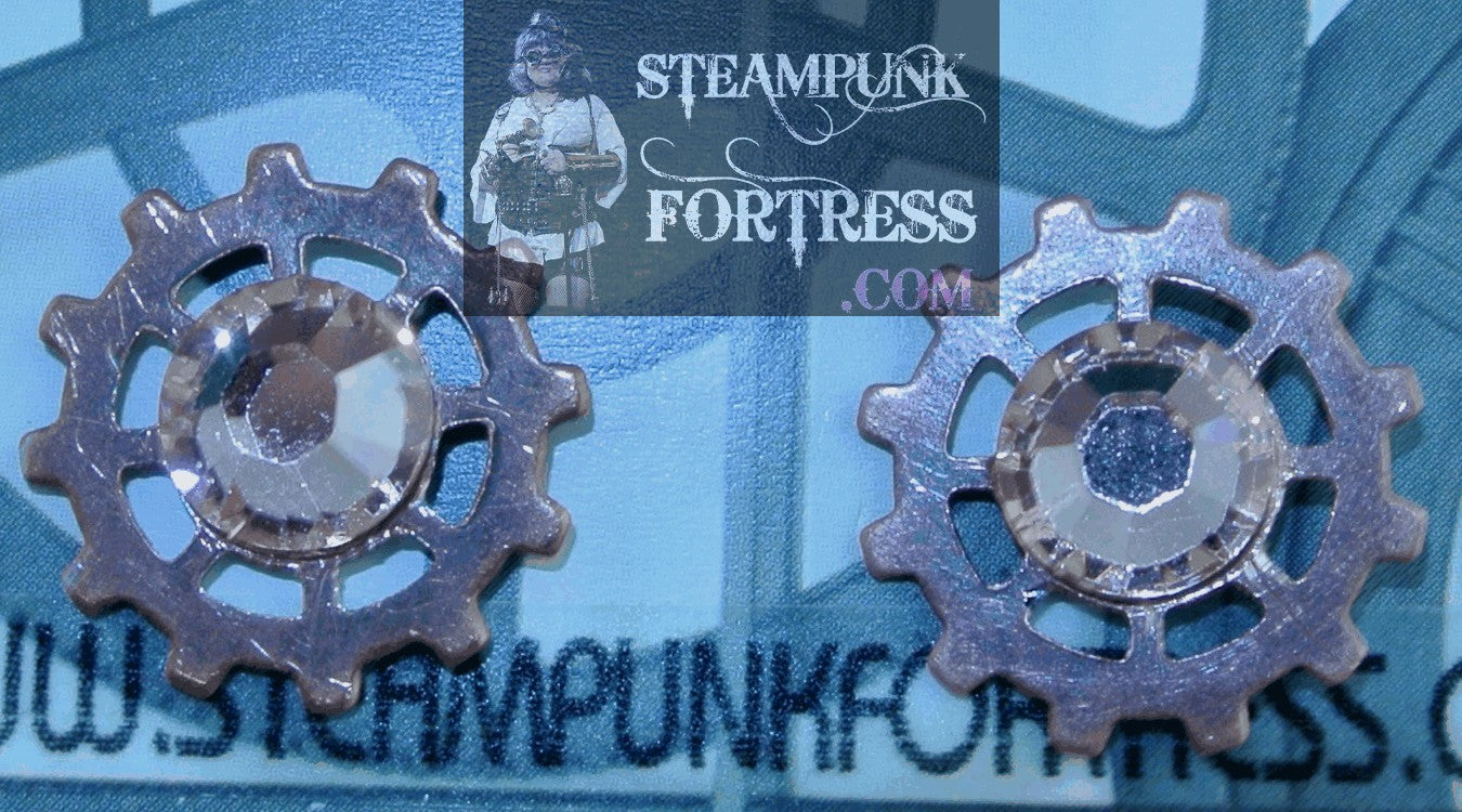 COPPER GEARS SPOKE 7MM LIGHT PEACH SWAROVSKI CRYSTALS STUDS PIERCED EARRINGS WATCH CLOCK STARR WILDE STEAMPUNK FORTRESS