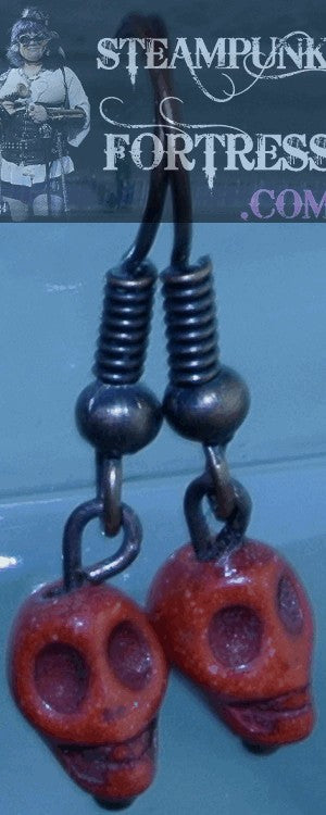 COPPER SKULLS HOWLITE RED TINY GEMSTONES PIRATE HALLOWEEN COPPER PIERCED EARRINGS STARR WILDE STEAMPUNK FORTRESS