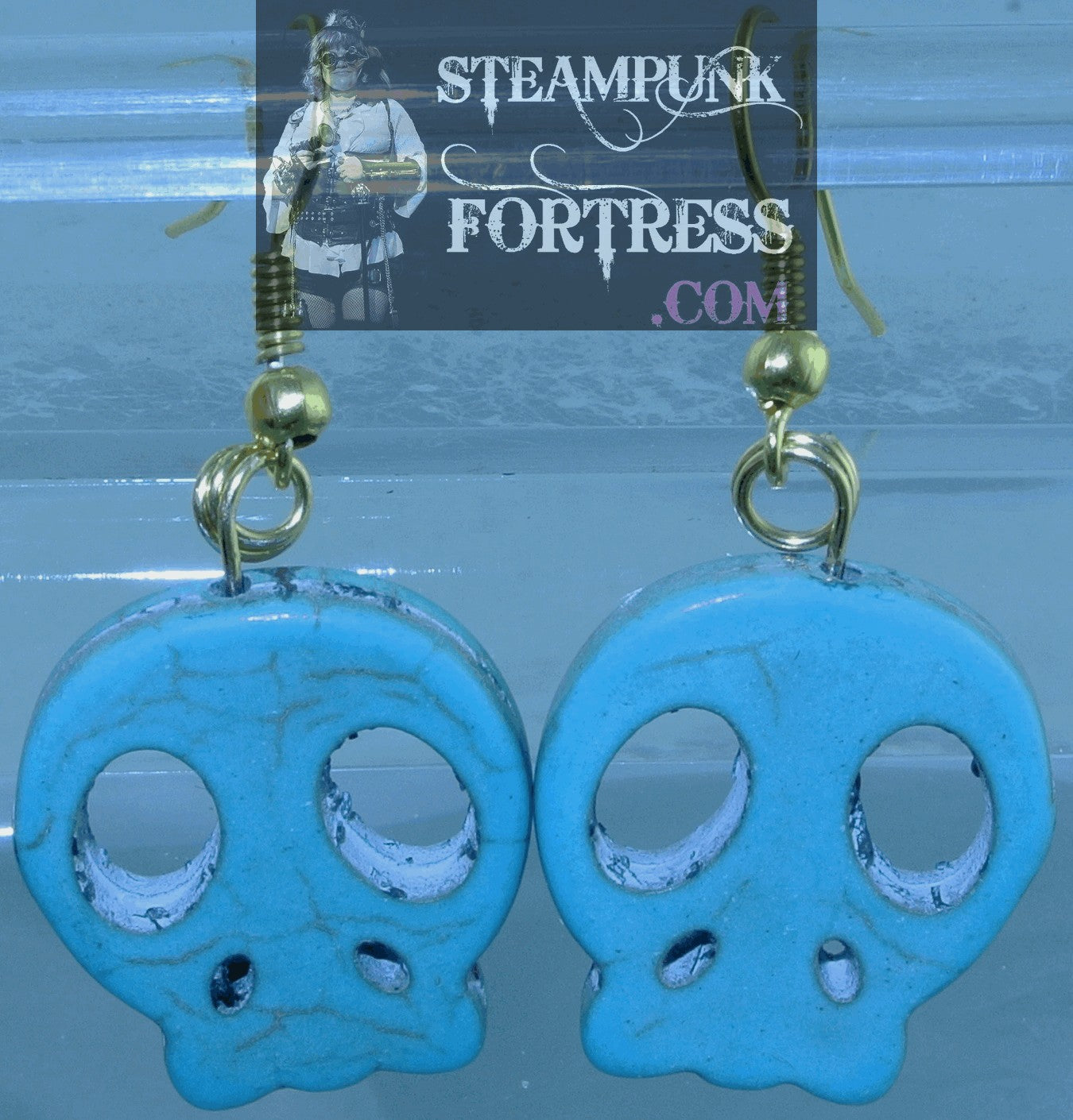 THIS IS A FABULOUS HANDMADE CUSTOM MADE STEAMPUNK DIESELPUNK CYBERPUNK, MEDIEVAL, RENAISSANCE, VICTORIAN, EDWARDIAN, COSPLAY COSTUME COMIC CON….PIERCED EARRINGS......GOLD....1 TURQUOISE SKULL FACE FLAT 3D HOWLITE GEMSTONE ON EACH HOOK....#5690