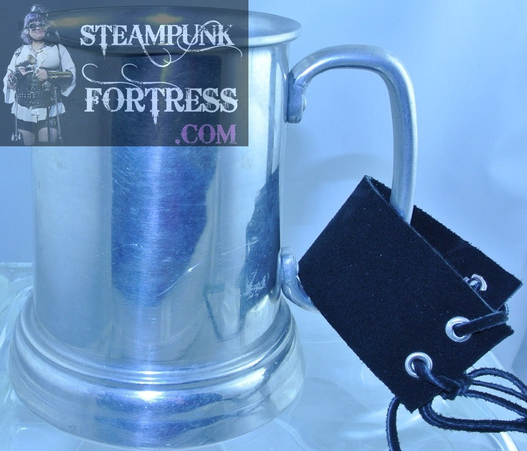 CUP SILVER CLEAR BOTTOM MUG BLACK SUEDE LEATHER STRAP STEIN STARR WILDE STEAMPUNK FORTRESS COSPLAY COSTUME