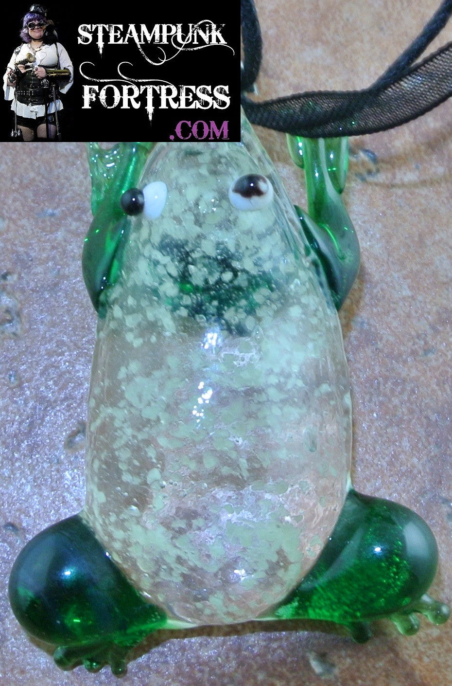 GLOW IN THE DARK GREEN GLASS FROG BLACK RIBBON NECKLACE STARR WILDE STEAMPUNK FORTRESS