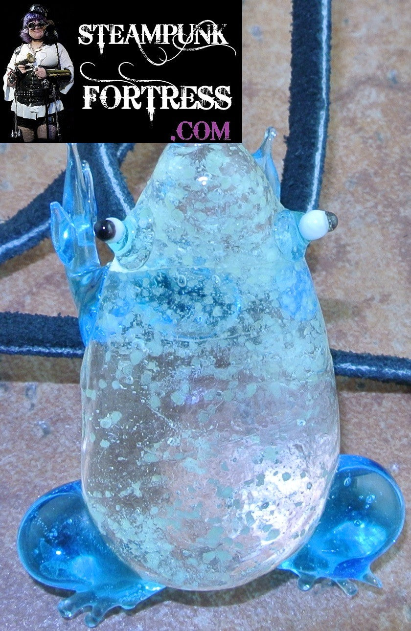 GLOW IN THE DARK LIGHT BLUE FROG BLACK LEATHER SUEDE CORD NECKLACE STARR WILDE STEAMPUNK FORTRESS