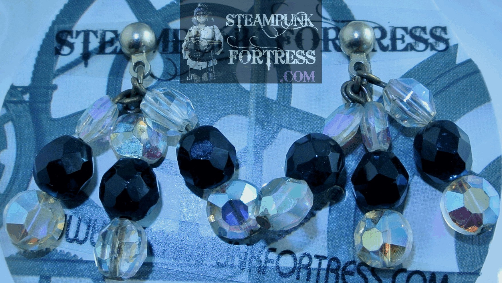 GOLD 3 PIN CLEAR AB AURORA BOREALIS RONDELLES BLACK ROUND SWAROVSKI CRYSTALS STUDS PIERCED EARRINGS STARR WILDE STEAMPUNK FORTRESS