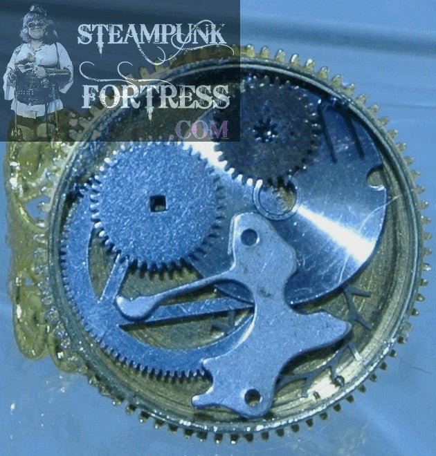 GOLD .75" AUTHENTIC GENUINE GEARS WATCH CLOCK CASE 3 SILVER SOLID GEARS PEG FILIGREE ADJUSTABLE RING STARR WILDE STEAMPUNK FORTRESS
