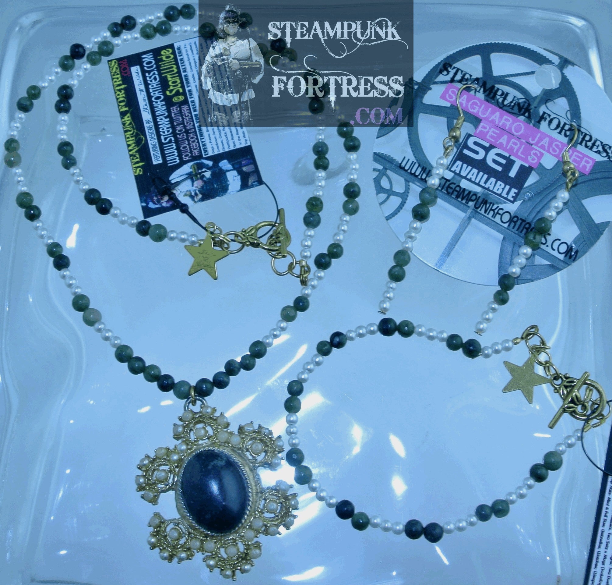 THIS IS A FABULOUS HANDMADE CUSTOM MADE STEAMPUNK DIESELPUNK CYBERPUNK, MEDIEVAL, RENAISSANCE, VICTORIAN, RENAISSANCE, EDWARDIAN, COSPLAY, COSTUME, SDCC, COMIC CON…..GOLD TONE PIERCED EARRINGS....THERE 4 SAGUARO JASPER GEMSTONE ROUNDS AND 9 PEARLS ON EACH HOOK.....#4417