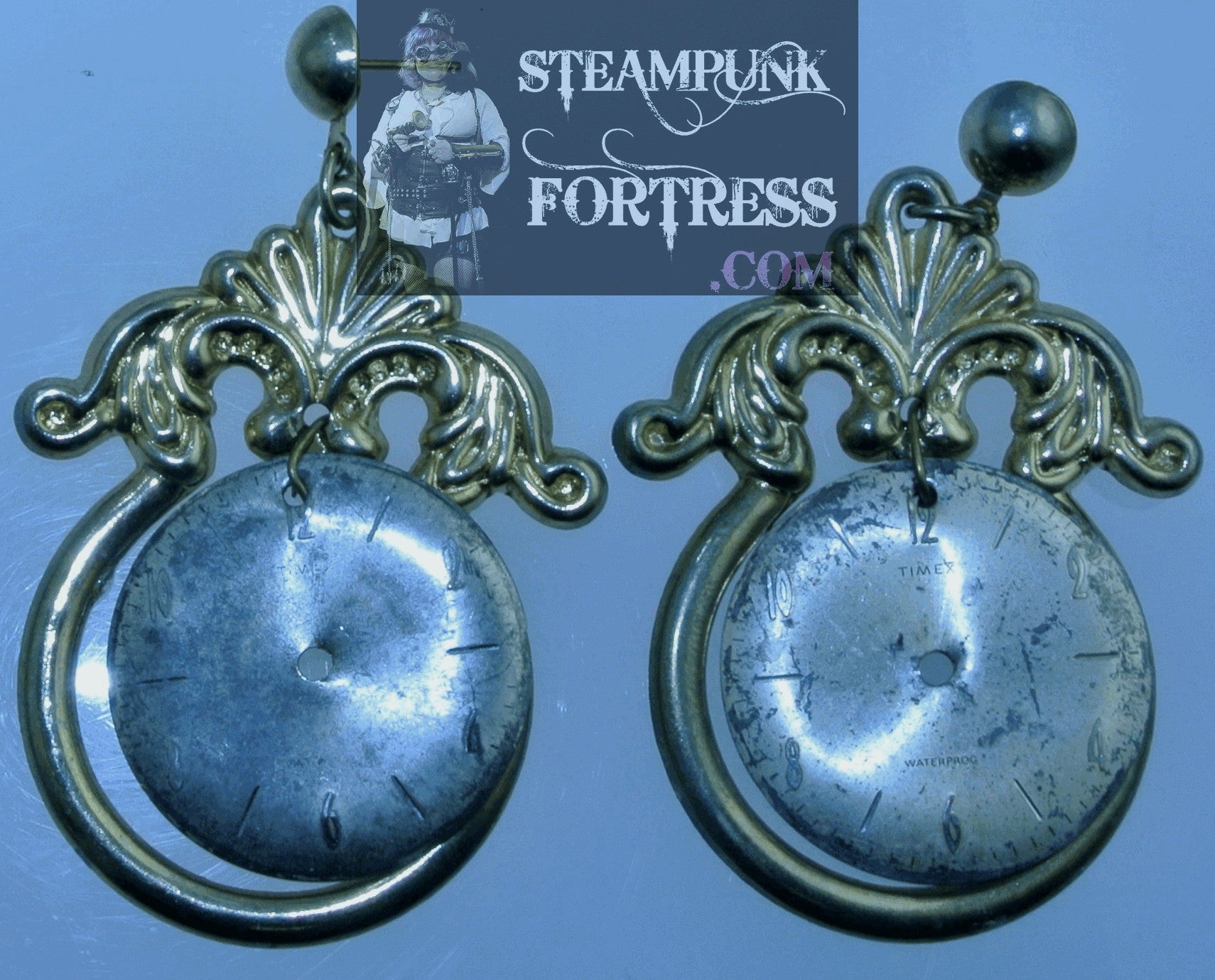 THIS IS A FABULOUS HANDMADE CUSTOM MADE STEAMPUNK DIESELPUNK CYBERPUNK, MEDIEVAL, RENAISSANCE, VICTORIAN, RENAISSANCE, EDWARDIAN, COSPLAY, COSTUME, SDCC, COMIC CON….. PIERCED EARRINGS....GOLD TONE.....1 GOLD TONE GENUINE TIMEX WATCH CLOCK FACE DIAL IN FRAME ON EACH HOOK...…#5389