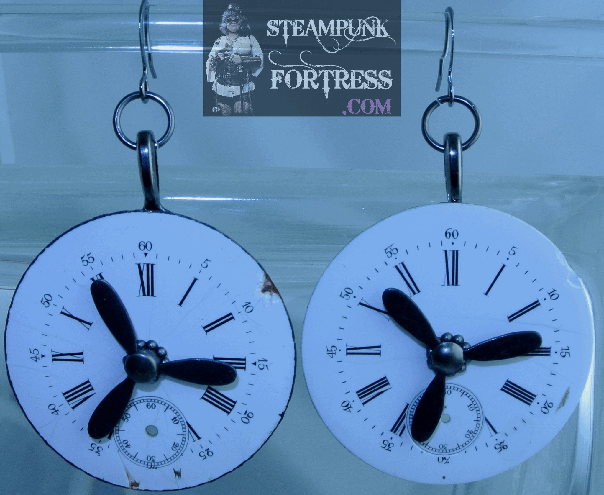THIS IS A FABULOUS HANDMADE CUSTOM MADE STEAMPUNK DIESELPUNK CYBERPUNK, MEDIEVAL, RENAISSANCE, VICTORIAN, RENAISSANCE, EDWARDIAN, COSPLAY, COSTUME, SDCC, COMIC CON…..PIERCED EARRINGS.....GUNMETAL.....1 PORCELAIN CLOCK WATCH FACE DIAL AND 1 BLACK PROPELLER THAT CAN ACTUALLY SPIN ON EACH HOOK.........#4499