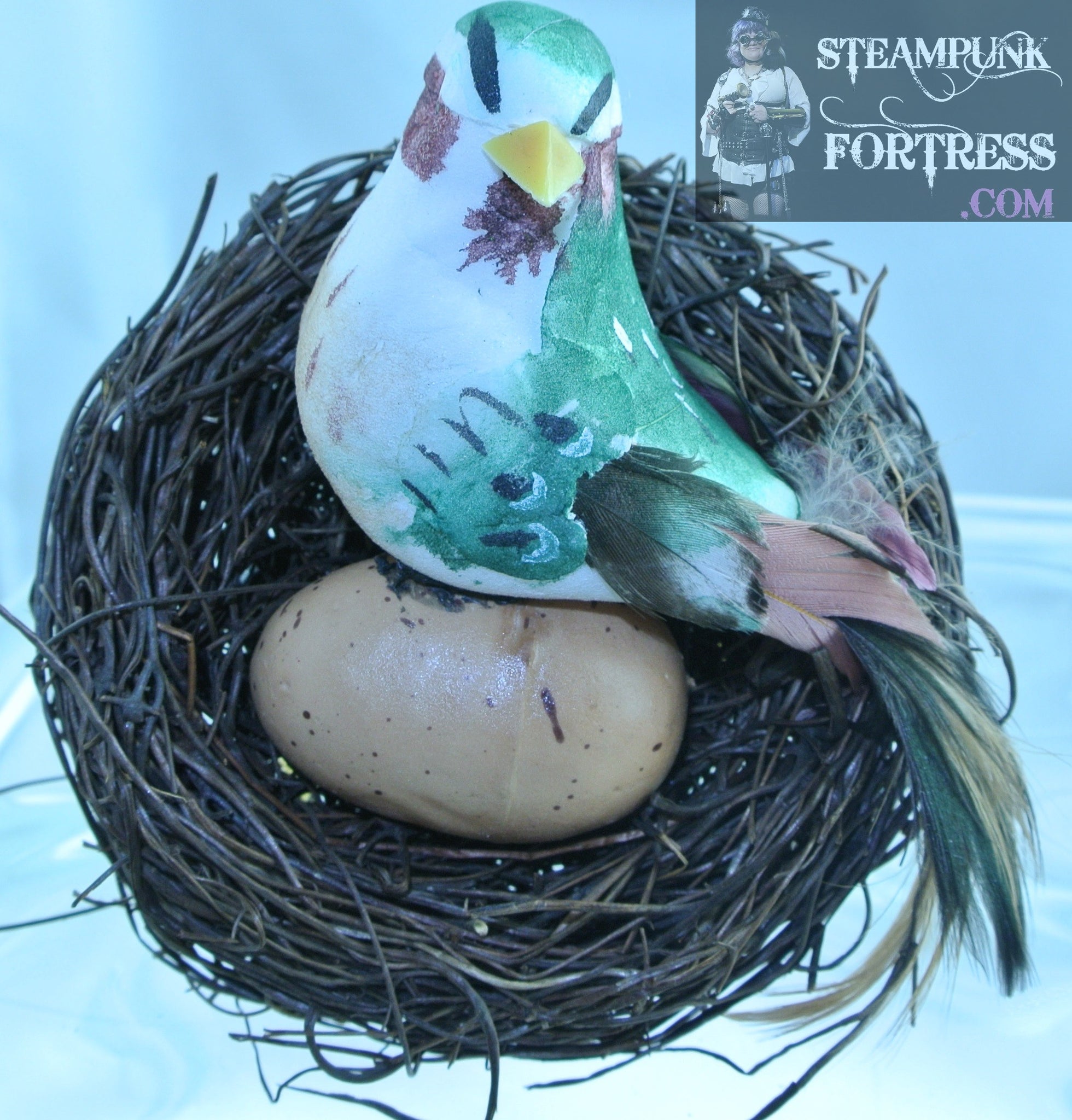 THIS IS A FABULOUS HANDMADE CUSTOM MADE STEAMPUNK DIESELPUNK CYBERPUNK, MEDIEVAL, RENAISSANCE, VICTORIAN, RENAISSANCE, EDWARDIAN, COSPLAY COSTUME COMIC CON HAIR ACCESSORY.…….GOLD HAIR COMB....BROWN GREEN BIRD ON BROWN EGG IN NEST...#4853