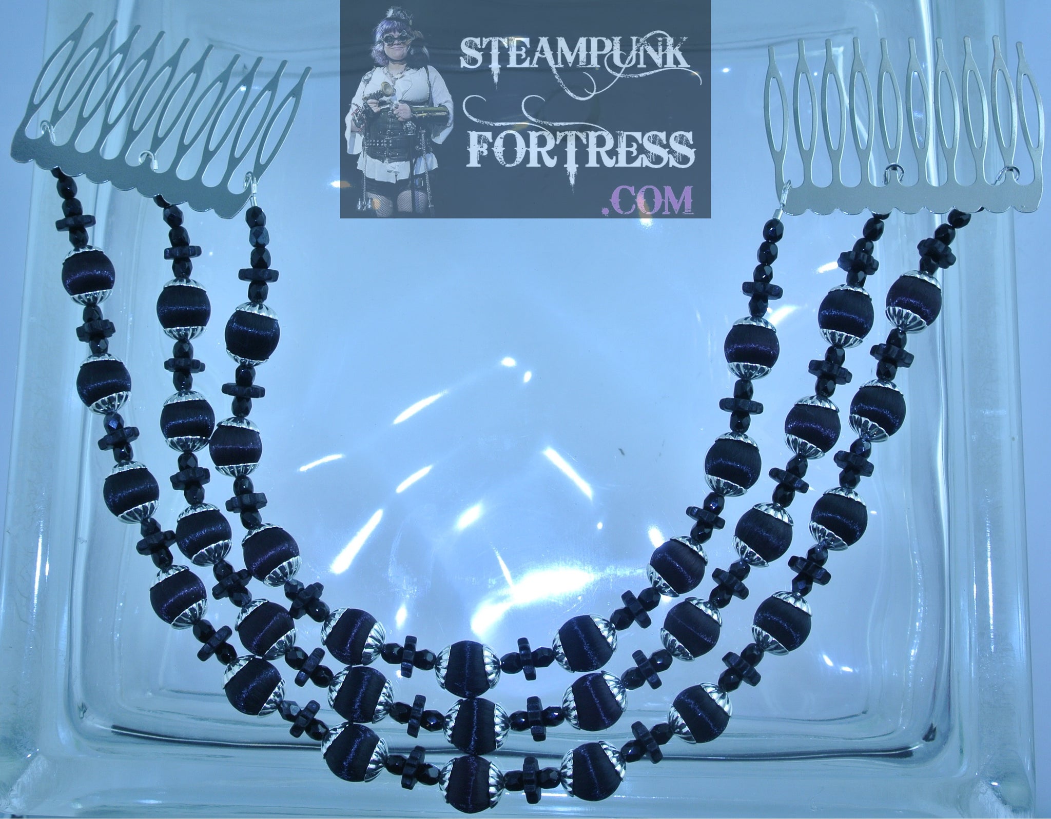 THIS IS A FABULOUS HANDMADE CUSTOM MADE STEAMPUNK DIESELPUNK CYBERPUNK, MEDIEVAL, RENAISSANCE, VICTORIAN, RENAISSANCE, EDWARDIAN, COSPLAY COSTUME COMIC CON HAIR ACCESSORY…SILVER HAIR TIARA COMBS....SILVER TONE WITH 3 STRANDS....BLACK NYLON BEADS SILVER RIBBED BEAD CAPS BLACK CERAMIC GEARS BLACK FACETED CRYSTALS......GORGEOUS FOR GOTHIC OR WINTER WEDDING....#3125