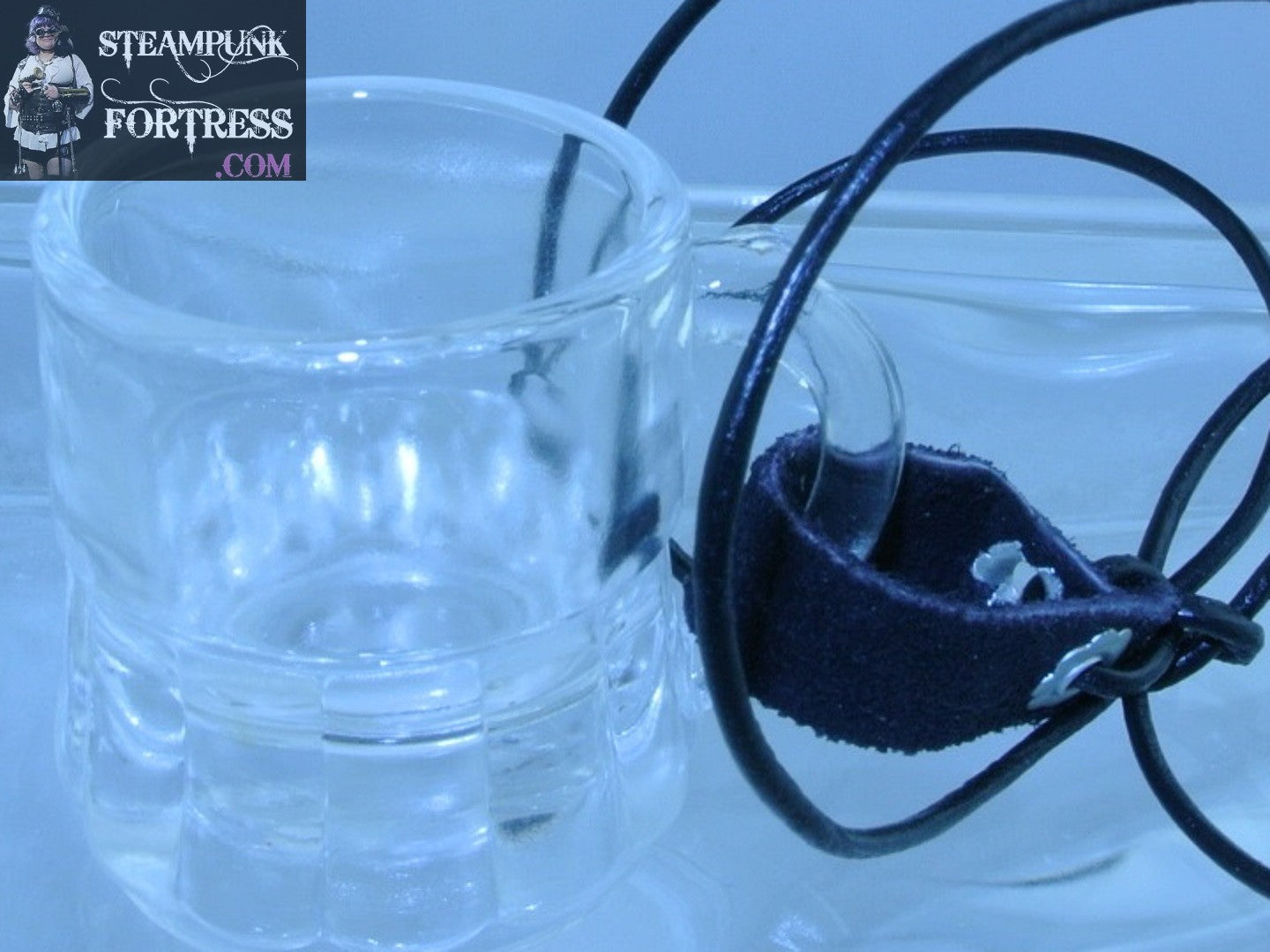 THIS IS A FABULOUS STEAMPUNK TEA CUP....GREAT FOR TEA DUELLING OR RENAISSANCE FAIRES...THIS ONE WE JUST ADDED THE BLACK SUEDE LEATHER STRAP TO THAT WAY YOU CAN CARRY IT ON YOUR BELT....THIS ONE IS KID SIZED CLEAR GLASS MUG...WAY TOO ADORABLE...OR KEEP FOR YOUR INNER CHILD....#4165