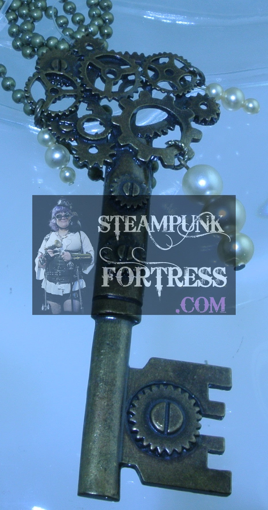 THIS IS A FABULOUS HANDMADE CUSTOM MADE STEAMPUNK DIESELPUNK CYBERPUNK NECKLACE.... BRASS…KEY WITH GEARS THAT HAS PEARL DANGLES THAT IS ALSO A PIN/BROOCH....#5923