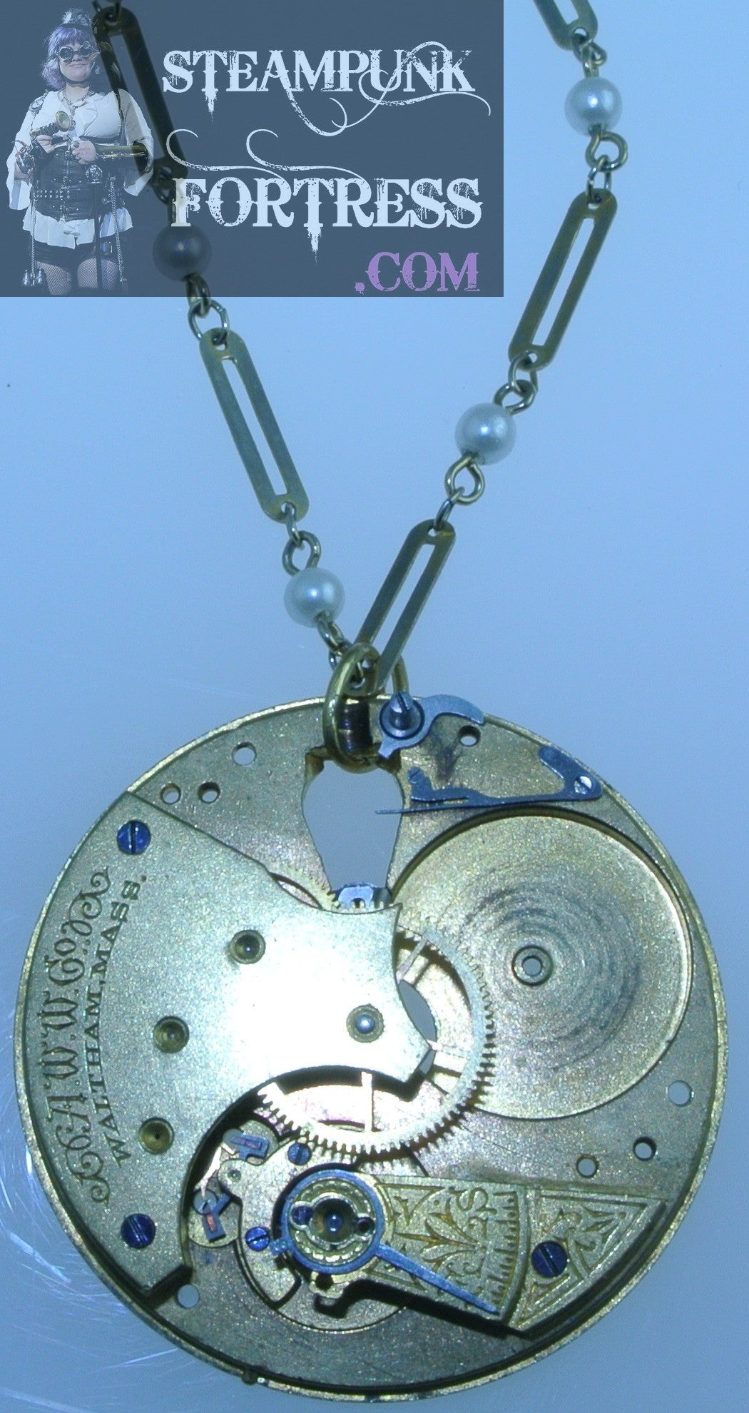 PIN BROOCH GOLD COMPLETE WALTHAM AUTHENTIC GENUINE WATCH CLOCK MOVEMENT PEARL CHAIN NECKLACE MULTI USE VERSATILE STARR WILDE STEAMPUNK FORTRESS