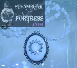 THIS IS A FABULOUS HANDMADE CUSTOM MADE STEAMPUNK DIESELPUNK CYBERPUNK NECKLACE.... SILVER….. SILVER ACCENTS AND SNOW QUARTZ GEMSTONE CHIPS WITH SILVER VINTAGE FRAME THAT IS ALSO A PIN/BROOCH WITH SNOW QUARTZ FOCAL AND SILVER GEAR....#1581