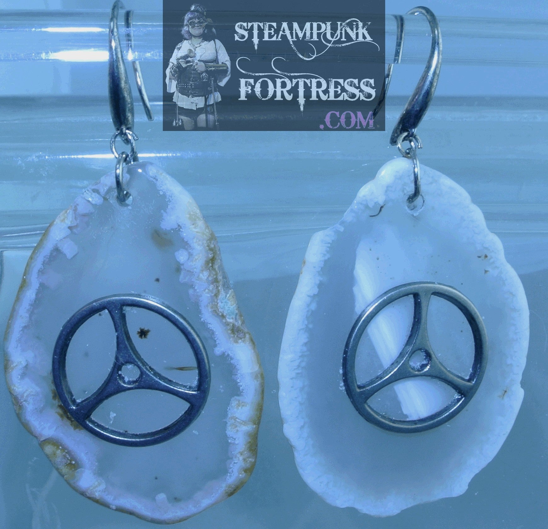 SILVER AMETHYST SLAB GEMSTONE 3 ARM GEARS WATCH CLOCK PIERCED EARRINGS 2 SIDED REVERSIBLE STARR WILDE STEAMPUNK FORTRESS
