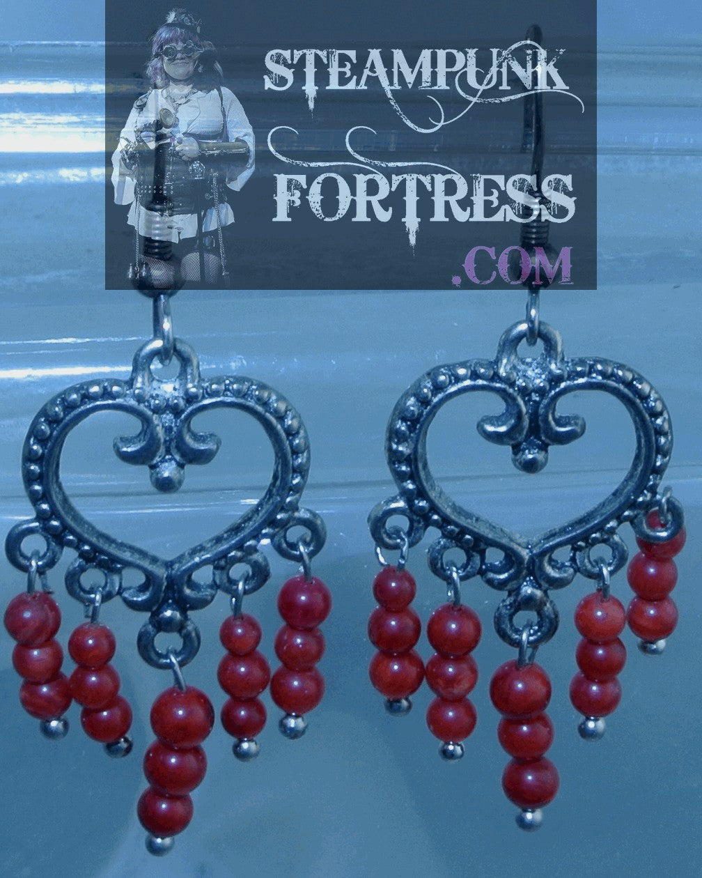 SILVER CORAL BAMBOO GEMSTONES SILVER HEART DROP DANGLES PIERCED EARRINGS STARR WILDE STEAMPUNK FORTRESS