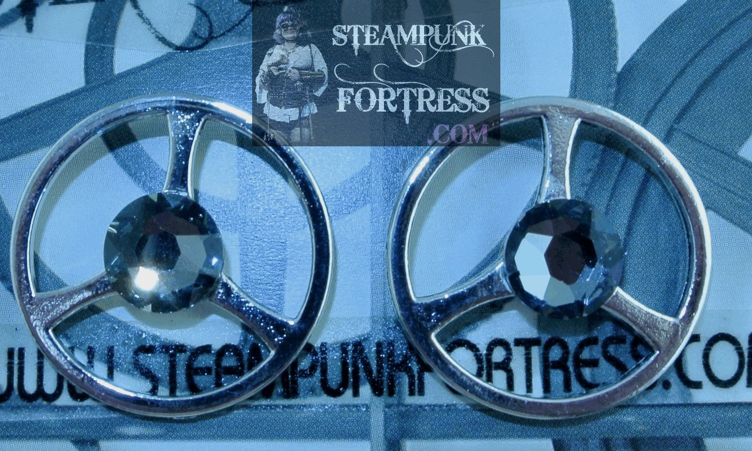SILVER GEARS 3 ARM 7MM SILVER NIGHT SWAROVSKI CRYSTALS STUDS PIERCED EARRINGS WATCH CLOCK SMOKIES GREY GRAY STARR WILDE STEAMPUNK FORTRESS