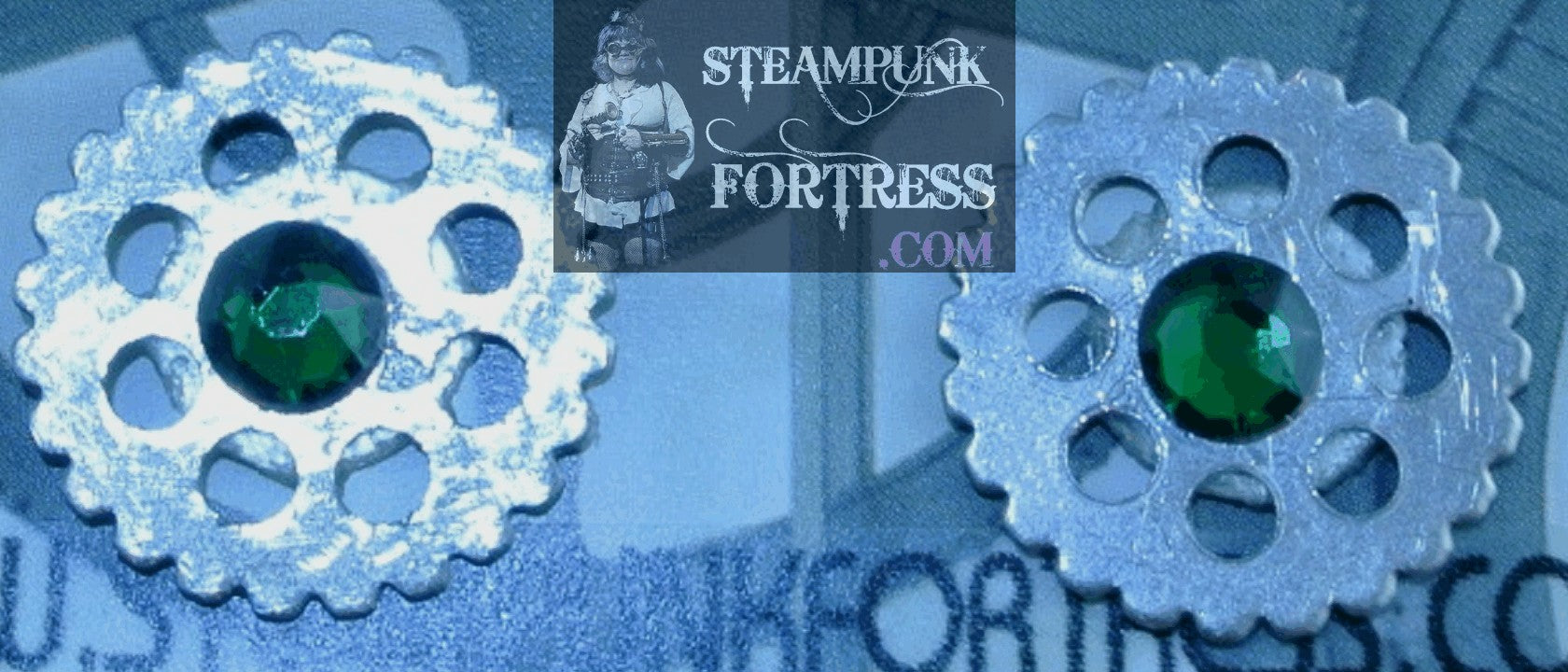 THIS IS A FABULOUS HANDMADE CUSTOM MADE STEAMPUNK DIESELPUNK CYBERPUNK, MEDIEVAL, RENAISSANCE, VICTORIAN, RENAISSANCE, EDWARDIAN, COSPLAY, COSTUME, SDCC, COMIC CON….. PIERCED EARRINGS......1 SILVER ROUND GEAR AND 1 GREEN SWAROVSKI CRYSTAL ON EACH STUD.......#1714