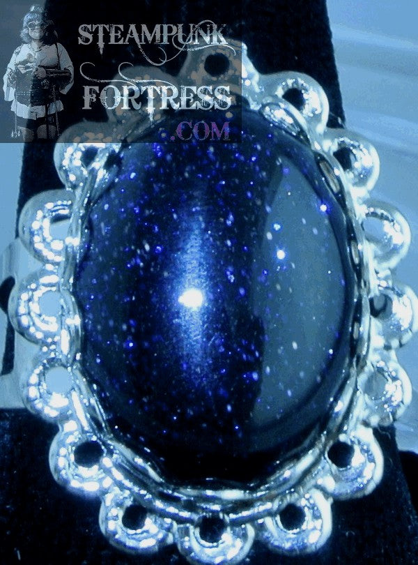 SILVER GOLDSTONE BLUE GEMSTONE STONES LACE EDGE 18MM X 13MM ADJUSTABLE RING GOLD STONE SPARKLES STARR WILDE STEAMPUNK FORTRESS