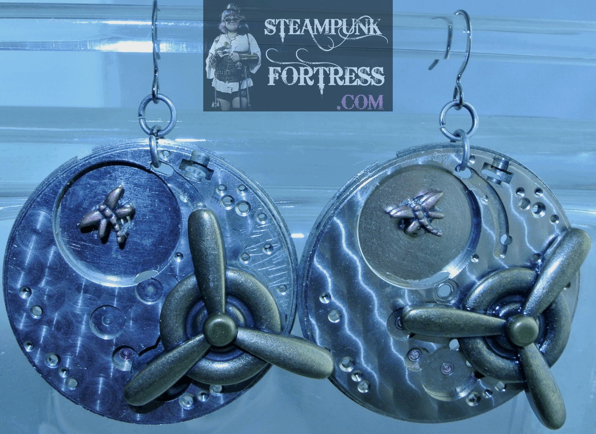 SILVER MOVEMENTS EMPTY ROUND AUTHENTIC GENUINE WATCH CLOCK COPPER DRAGONFLY DRAGONFLIES BRASS PROPELLERS KINETIC SPINS SPINNING PIERCED EARRINGS STARR WILDE STEAMPUNK FORTRESS