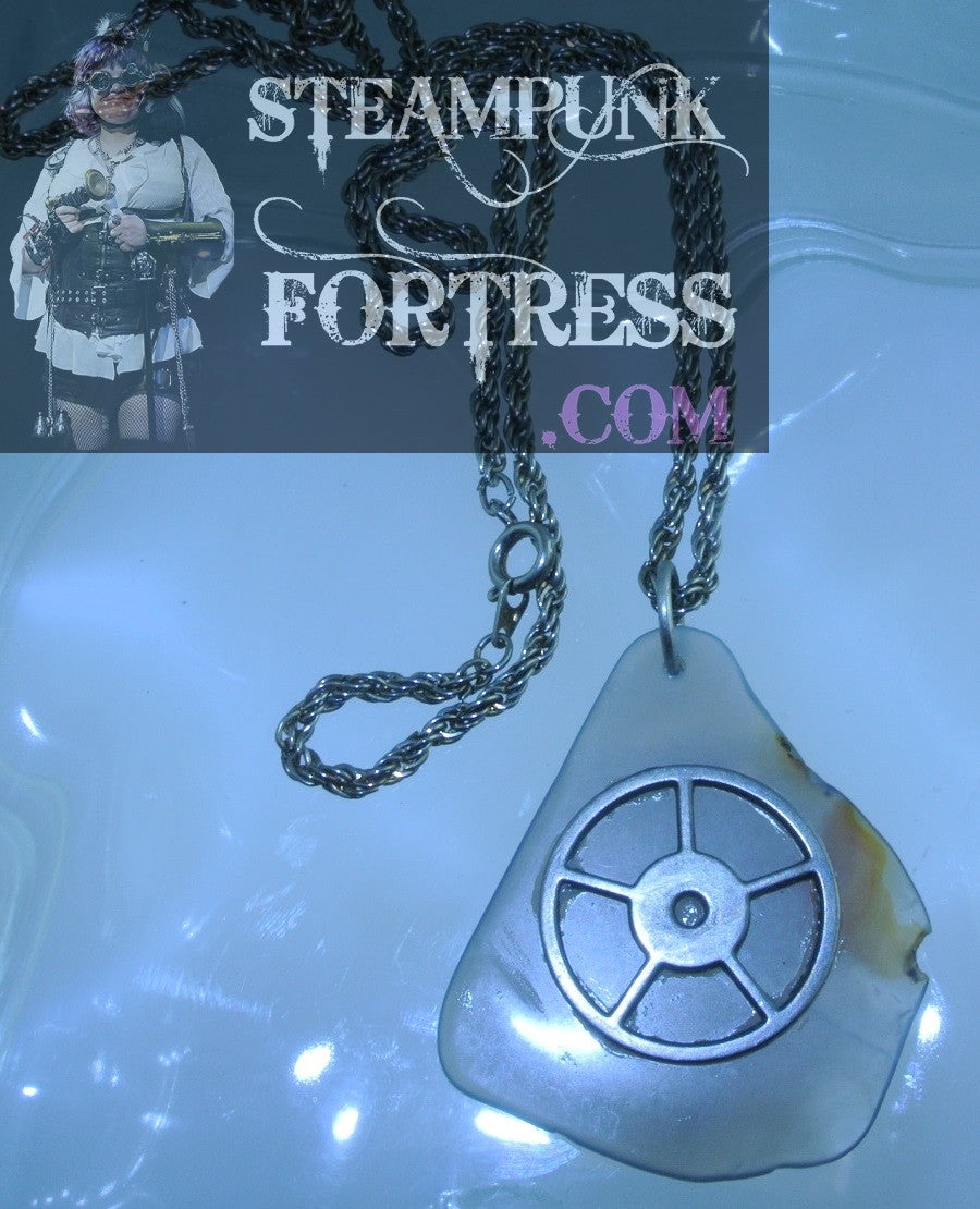 SILVER QUARTZ LAVENDER GEMSTONE STONE SLICE SLAB SILVER 5 ARM GEAR NECKLACE 2 SIDED REVERSIBLE STARR WILDE STEAMPUNK FORTRESS