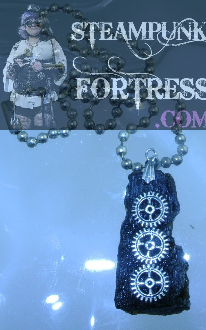 THIS IS A FABULOUS HANDMADE CUSTOM MADE STEAMPUNK DIESELPUNK CYBERPUNK NECKLACE.... SILVER…..SILVER BALL CHAIN TEKTITE GEMSTONE FOCAL #4 WITH 3 SILVER GEARS....THE OTHER SIDE IS PLAIN SO IT IS REVERSIBLE...#3881