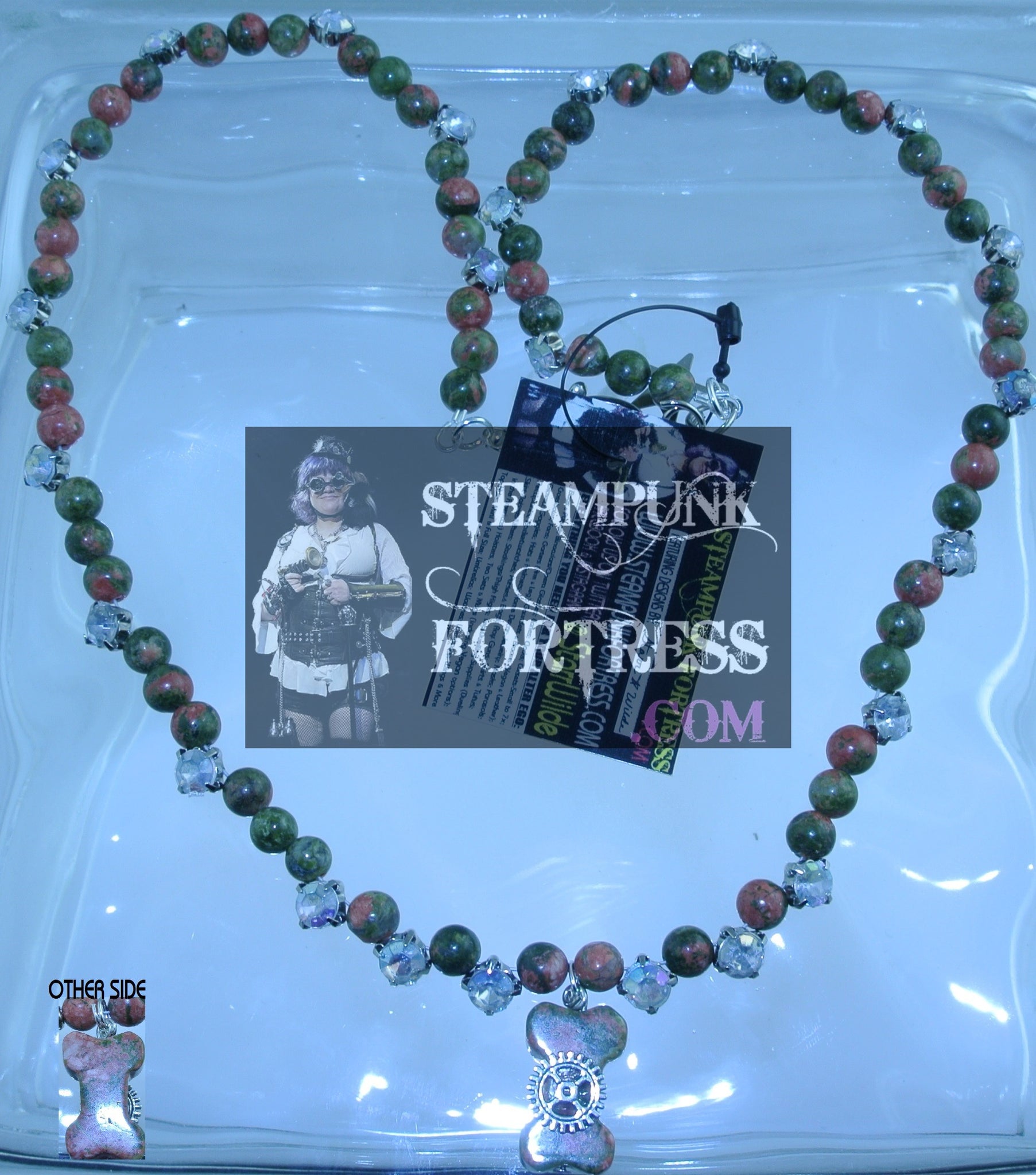 SILVER UNAKITE DOG BONE GEMSTONES STONES ROUNDS RHINESTONES SILVER GEAR NECKLACE SET AVAILABLE 2 SIDED REVERSIBLE STARR WILDE STEAMPUNK FORTRESS
