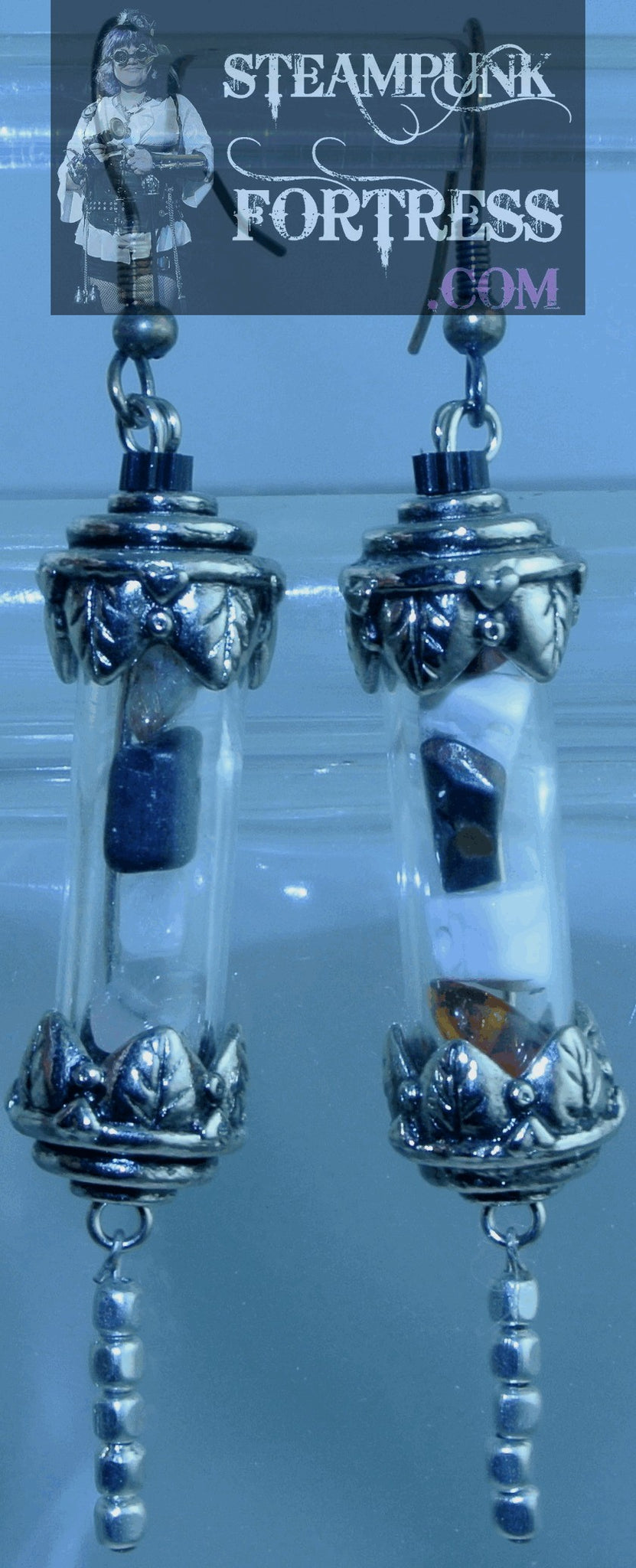 SILVER VIAL SCROLL GLASS MIXED GEMSTONES STONES CHIPS SILVER SEED BEADS PIERCED EARRINGS STARR WILDE STEAMPUNK FORTRESS
