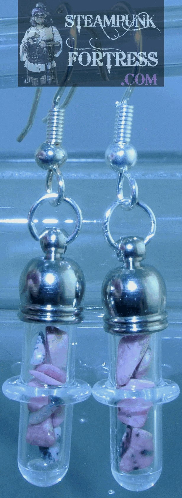 SILVER VIALS TEST TUBES GLASS CIRCLE RHODONITE GEMSTONES STONE CHIPS PIERCED EARRINGS STARR WILDE STEAMPUNK FORTRESS