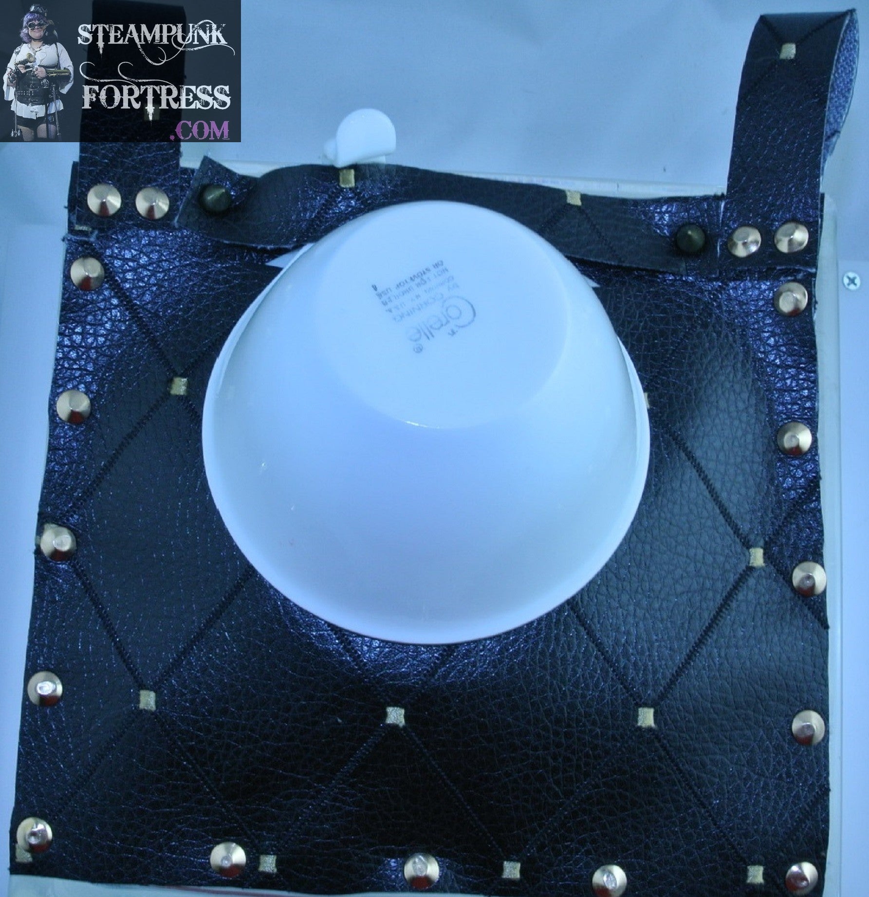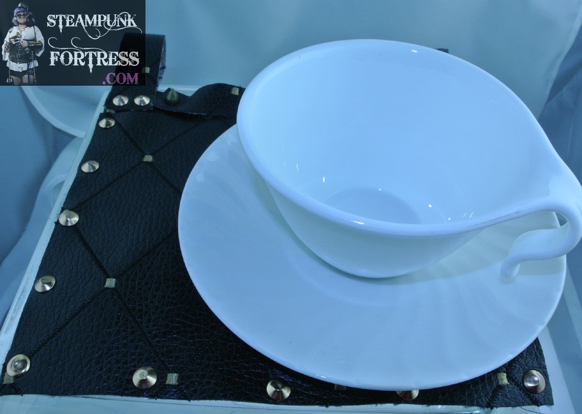 TEA CUP HOLDER FAUX LEATHER VEGAN BLACK DIAMOND WHITE CHINA HOLSTER SET DUELING DUELLING SAUCER STARR WILDE STEAMPUNK FORTRESS COSPLAY COSTUME