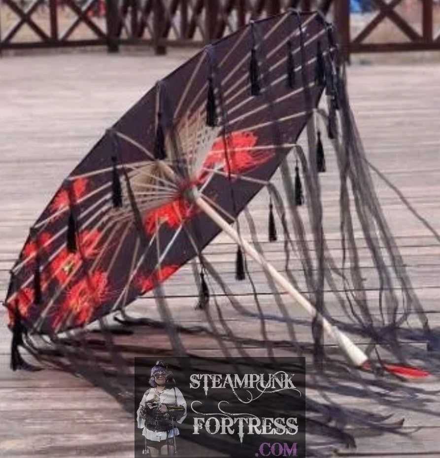 BLACK RED ORIENTAL FLOWERS BLACK TASSELS TULLE STRIPS STEAMPUNK UMBRELLA PARASOL PAGODA VICTORIAN EDWARDIAN GOTHIC WEDDING COSPLAY COSTUME- MASS PRODUCED